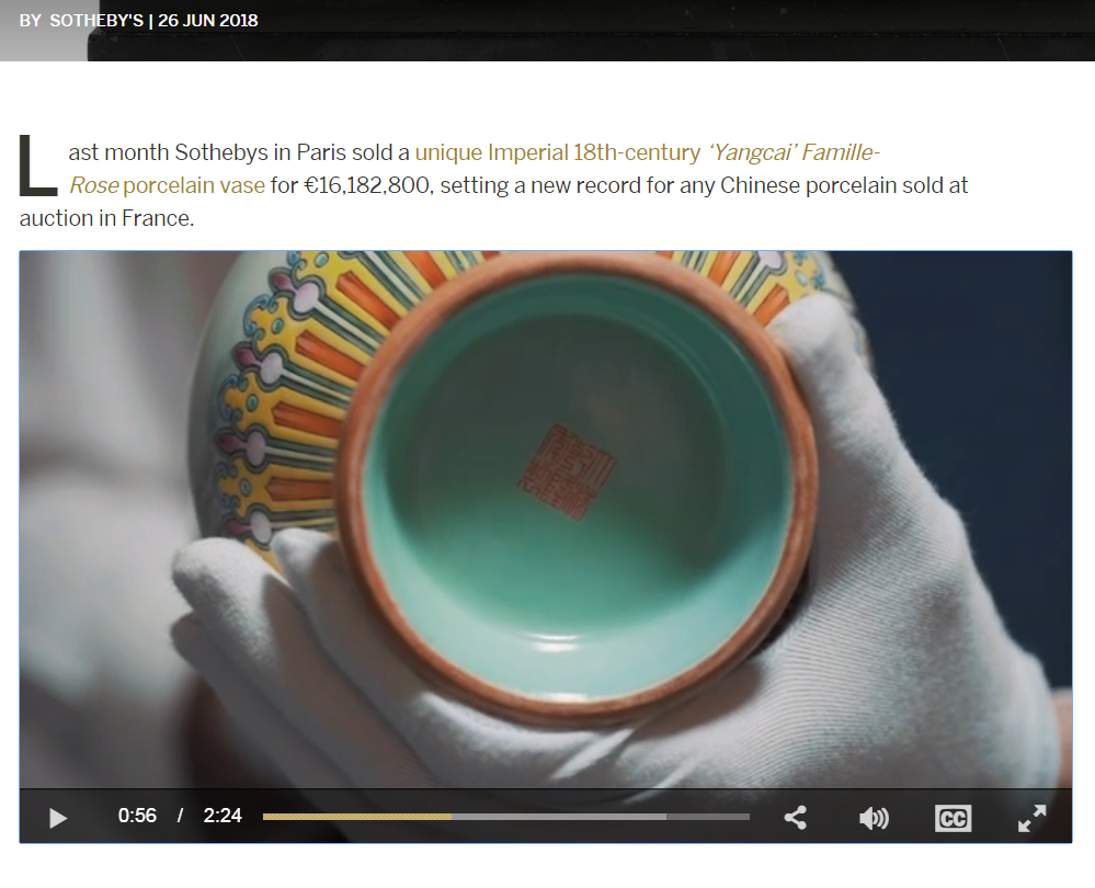 本乾隆粉彩棒槌瓶的款识为“无点大”“横日清”“一生隆”的乾隆朝官窑纪年款。 乾隆粉彩瓷器不仅有重要的艺术价值,同时也有很高的经济价值。 |