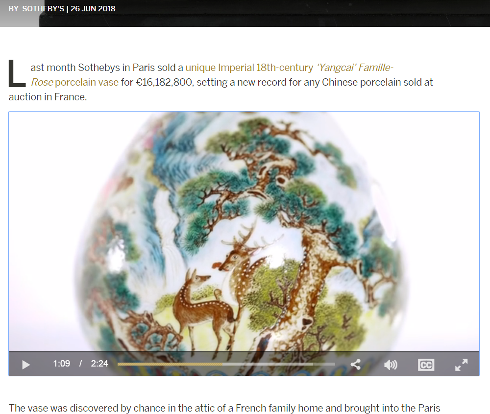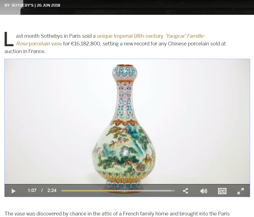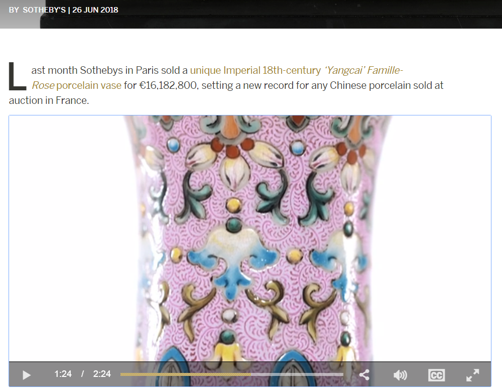乾隆官窑粉彩的纹饰一般是“大内”送来的图样,主题纹饰按不同时节都有严格规定。除以粉彩绘画为主,还常加绘料彩、金彩或黑彩,或与青花、五彩、斗彩并施于一器,这种在一件器物上施多种彩或同时以各种彩绘工艺制作的乾隆粉彩,可说是集多种陶瓷工艺成就于一身,充分反映了乾隆朝制瓷工艺的精湛。 乾隆时期,(1736---1795)为清代瓷器制作的鼎盛期,从乾隆开始,粉彩在彩瓷的领域中几乎完全取代了五彩的地位。这时粉彩在装饰工艺上渐趋繁缛,形制上丰富多样,特别是用于陈设的各大器型,如转颈瓶,转心瓶,天球瓶,扁瓶,多角瓶等甚为流行。这些 工艺繁复,色彩浓艳明丽的器皿是乾隆彩瓷志制品中的杰出代表。
