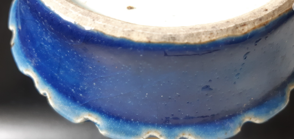 青花下沉:折沿处的青花色泽浓郁,且能看到颜色“吃”进釉里的沉降感。这种发色在嘉靖、万历时期多使用国产“石子青”混入少量“回青”,色调蓝中微泛紫或发灰,极具时代特征。