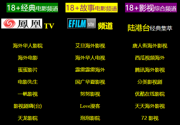 全频道:1)加数十个影视频道;2)加二万多部全球电影电视;3)加R17/成人频道/更多...