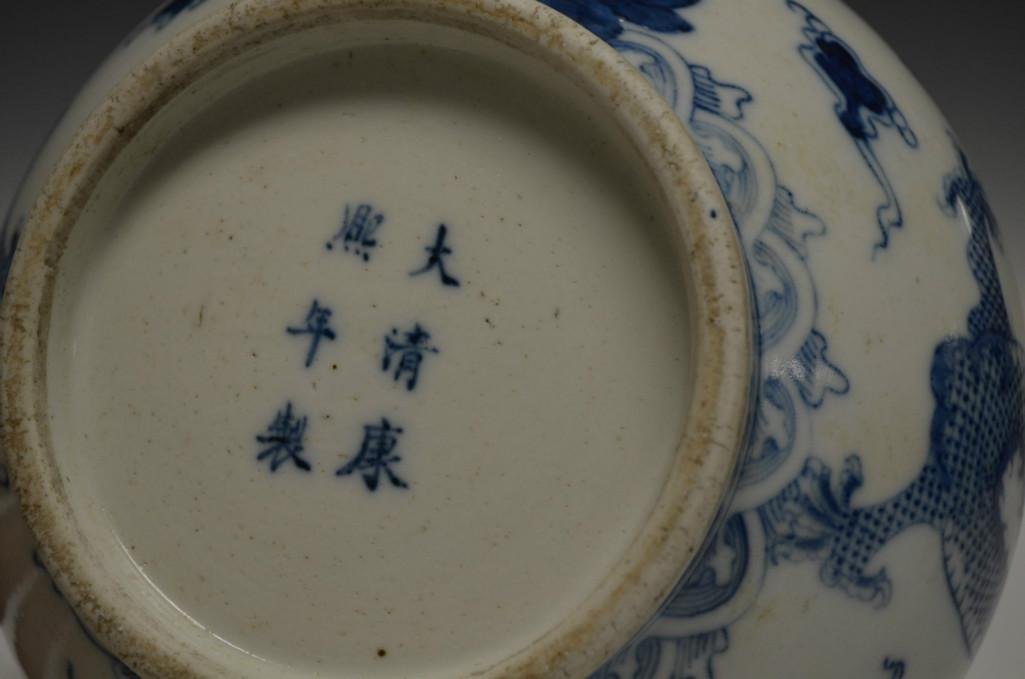 康熙青花料采用浙料,色泽鲜艳青翠,其中一个重要特征是康熙青花浓淡有层次,且有指印纹。器物以小件日用瓷和文房用具为主。图案花纹以龙、凤、缠枝莲、山水、花卉居多。民窑的图案也丰富多彩,大量出现整幅画面,如岁寒三友、米芾拜石等,也有西厢记、三国演义等故事内容。明末清初青花瓷出口量大,为康熙青花瓷的发展创造了有利条件。