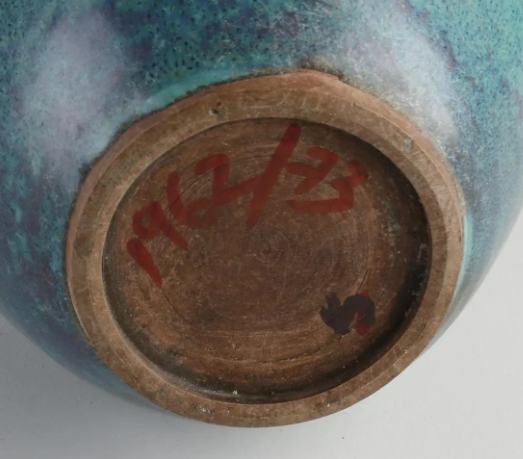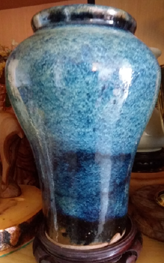 (2)窑变,系各种釉色交汇变化而成,这是宋钧窑瓷区别于同时代其它青瓷的重要特点,其中红、蓝色相融形成极度为美丽的紫色。