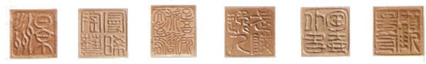 (1)“大彬”,刻款,款在把下。(2)“康熙御制”章款。款在底部。(3)“鸣远”刻款,“陈鸣远”章款,款均在壶身。(4)“荆溪华凤翔制”章款。(5)“大清乾隆年制”章款。(6)“玉香斋”刻款。(7)“曼生铭”“彭年”盖印,“阿曼陀室”印章,款在底部。(8)“岁在辛卯仲冬虔荣制时年七十六并书”刻款,款在底部。(9)“友兰”盖印,“符生邓奎监造”底印。此壶为邵友兰访曼生壶式,符生邓奎监造。(10)“友廷”盖印,“福”把梢印。(11)“光裕”盖印,“己酉(1909年)劝业会纪念品”纪念款。(l2)“陈鼎和陶器厂”章款,“陈鼎和”刻款、“郭记”盖印,底有“宜兴紫砂”长方印,“郭记”扇形印。陈鼎和是本世纪初期一家公司的名字,经理人陈元明。这家公司经营作品有茗壶、茶具、茶杯、暖酒杯、笔洗、花瓶等。器皿上铭文多有“陈鼎和”签款,或底铃篆文方印:“陈鼎和陶瓷厂”。有的还印有英文C.T.H.CO的字样。