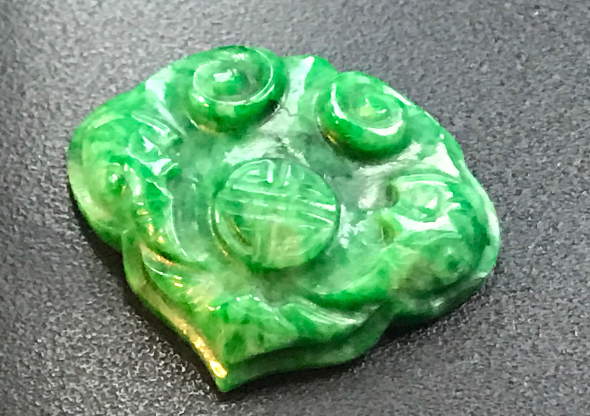 染绿色石英岩一般为半透明,玻璃光泽,早期的颜色均匀,色调偏蓝或偏黄,不够自然,现在的产品则更为逼真,颜色可有浅变化,更为自然。