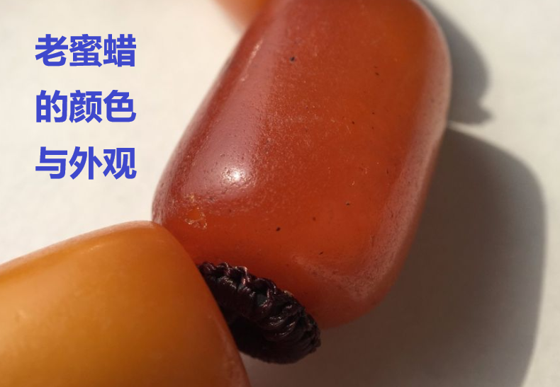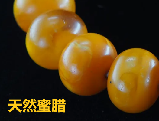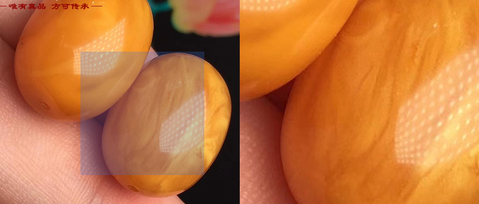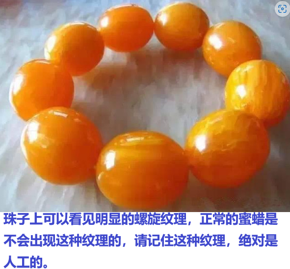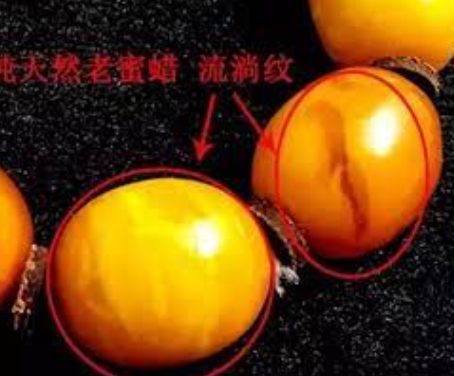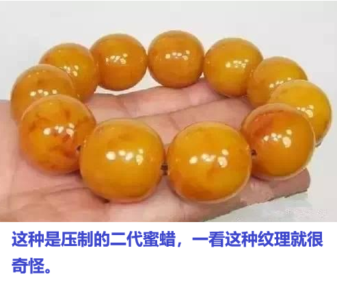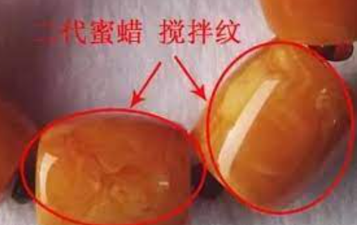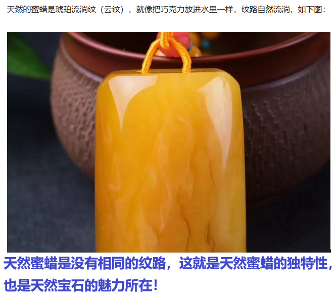 而压制蜜蜡的流淌纹与天然蜜蜡的(较规则、边界清晰、由无数微小气泡群组成的似玛瑙纹)有明显差异,