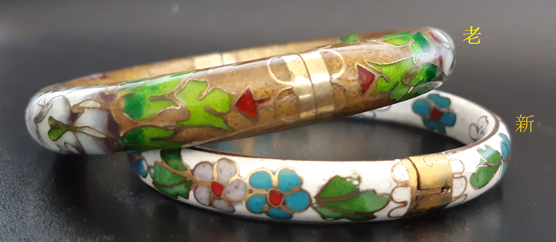 2、老货的铜胎为紫(红)铜;新货的铜质量不是太好,比较软。接口处出现晃动在现代景泰蓝手镯中是正常的。