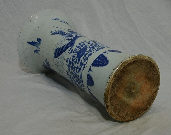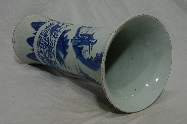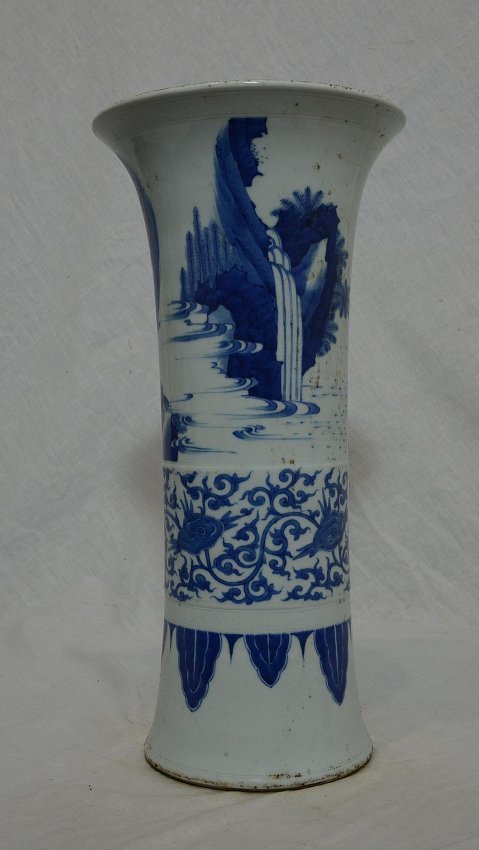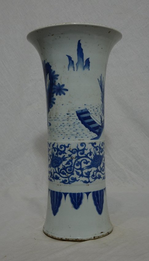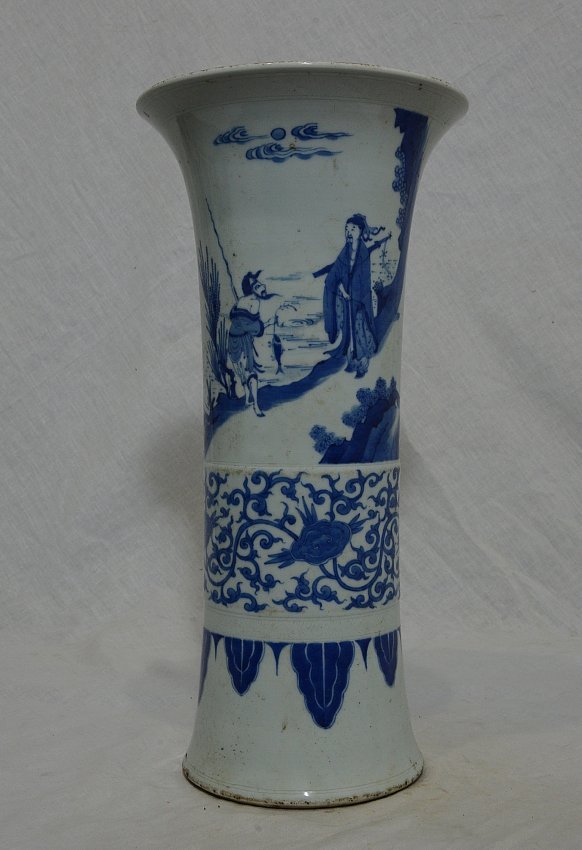 Chinese blue and white porcelain beaker vase, decorated with figures and landscape view. Good condition. 15.75" height.