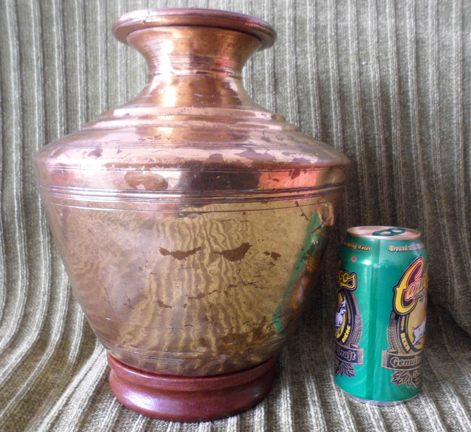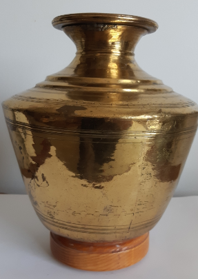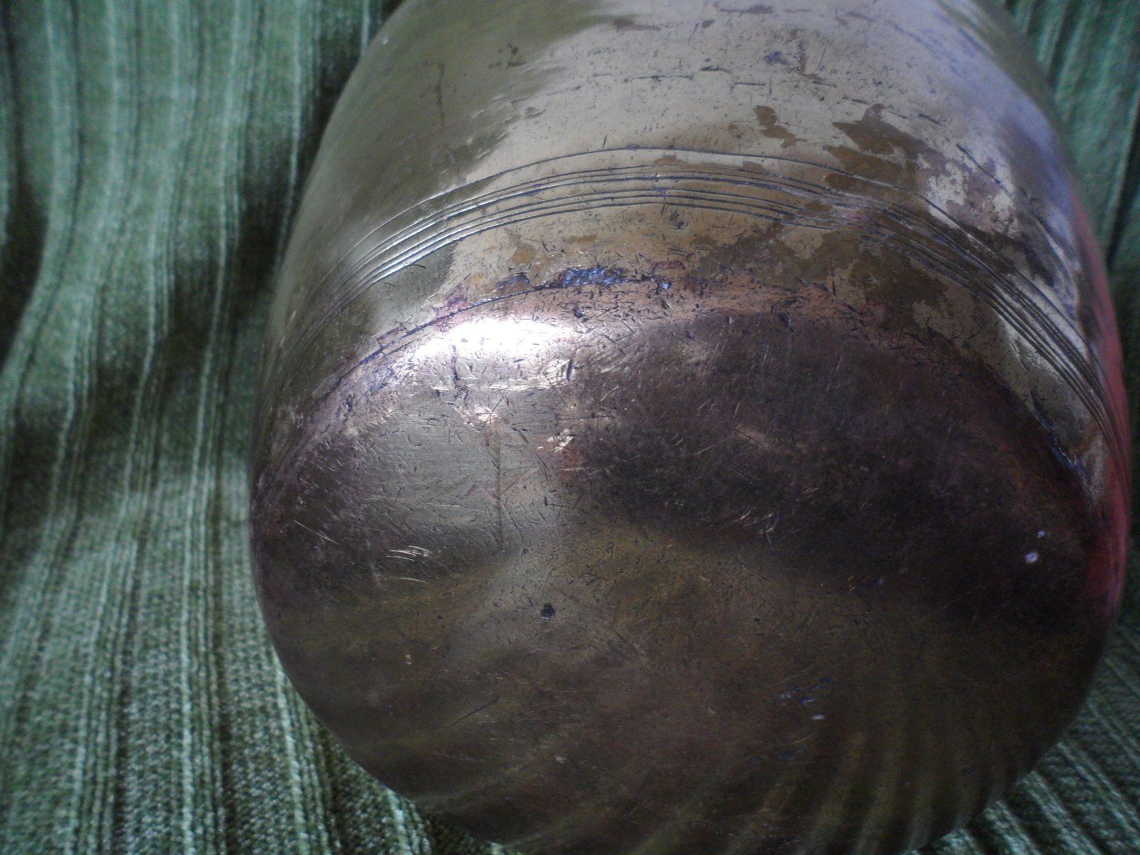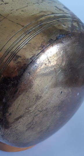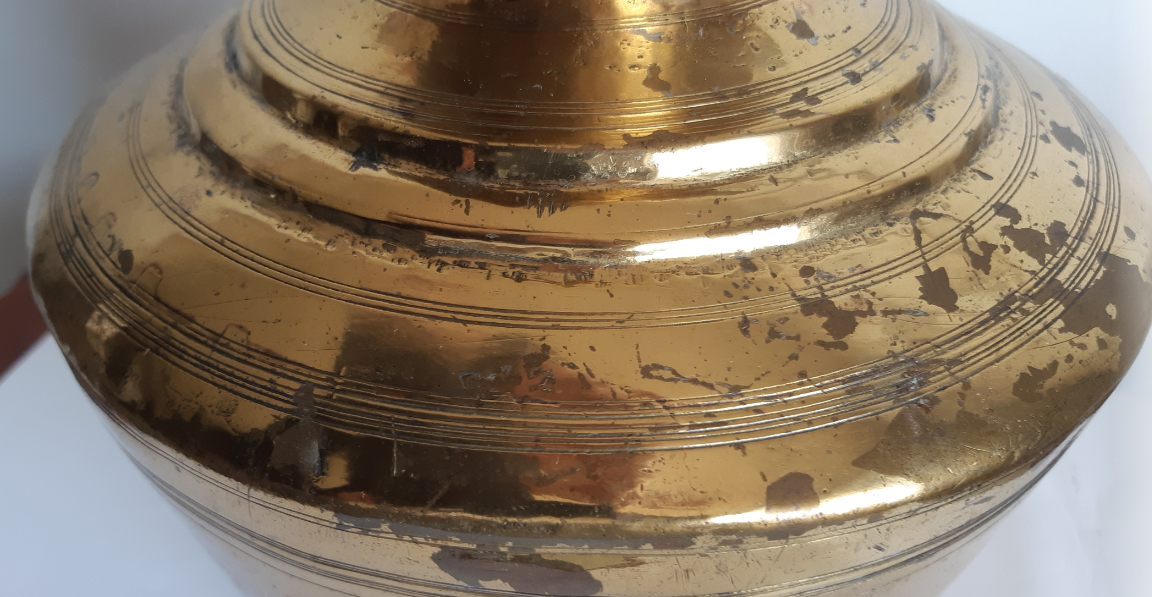 从这张高清局部图来看,这件器物的表面工艺细节提供了非常关键的鉴定线索。这种“金层脱落”的方式和底胎的质感,进一步印证了它作为艺术陈设品的高级属性。 关键细节解读: 金层脱落特征(片状剥落): 图中的金层呈现出明显的不规则片状脱落,边缘锐利。这种现象常见于厚层电镀(Heavy Electroplating)或早期的贴金/包金工艺,而非汞镀金(汞镀金通常是均匀磨损变薄)。这种厚度的金层(Gold Layer)在光线下色泽纯正,极具视觉冲击力。 底胎的“熟旧”感: 金层脱落后露出的基底颜色较深,带有自然的氧化斑点和划痕。这说明金层之下的铜胎已经经过了长时间的自然陈化。这些细小的磕碰痕迹和磨损(尤其是在凸起的弦纹边缘)是真古器的重要标志,无法通过现代做旧完全模仿。 装饰线(弦纹)细节:表面那几组平行的环绕线条非常规整,这是在车床上高速旋转时用刻刀压划出来的。这种简约的装饰风格与厚重的金层结合,体现了典型的 19 世纪末至 20 世纪初“装饰艺术(Art Deco)”影响下的印度高级工艺。