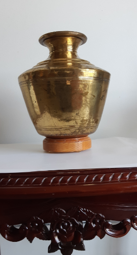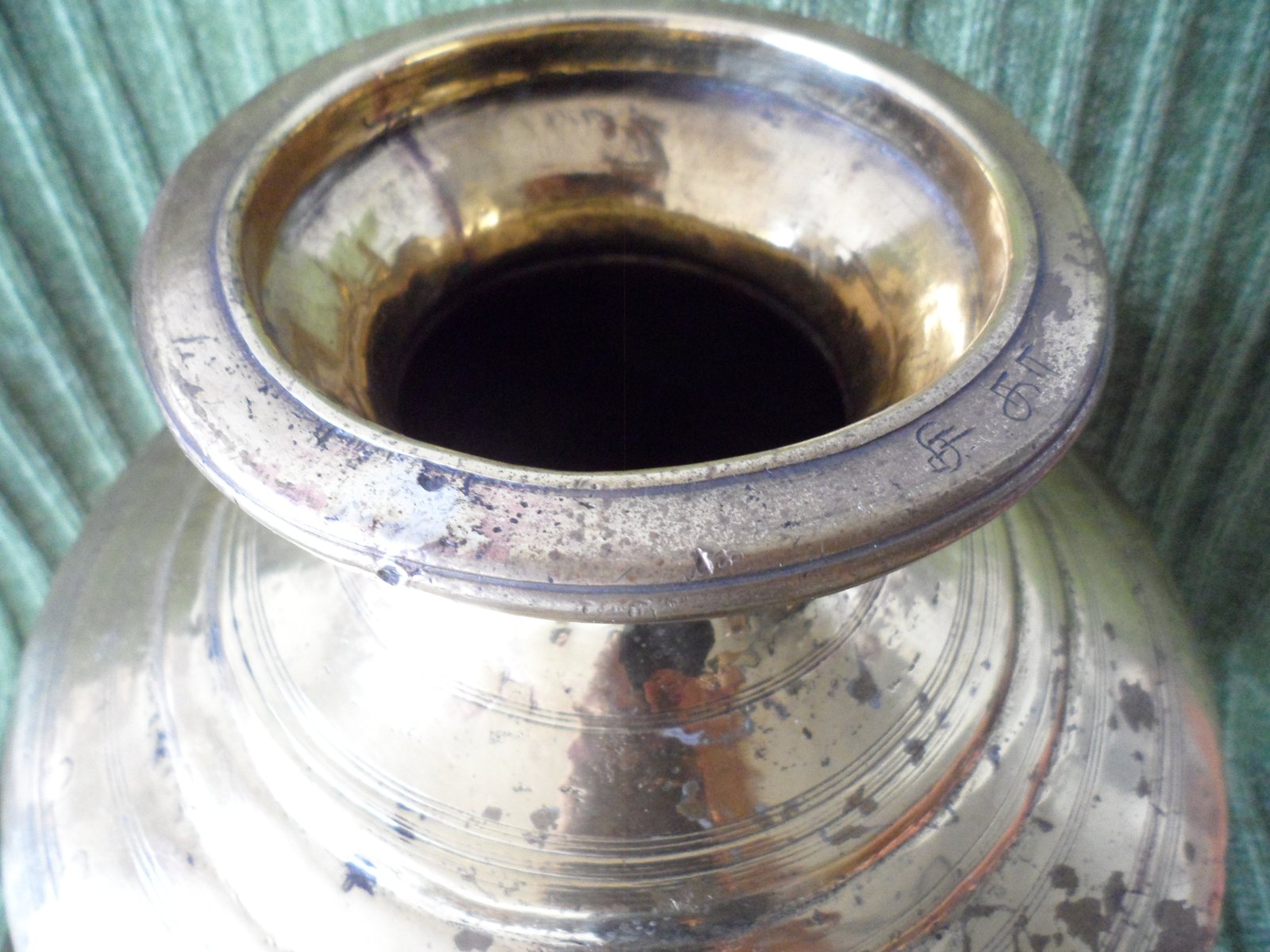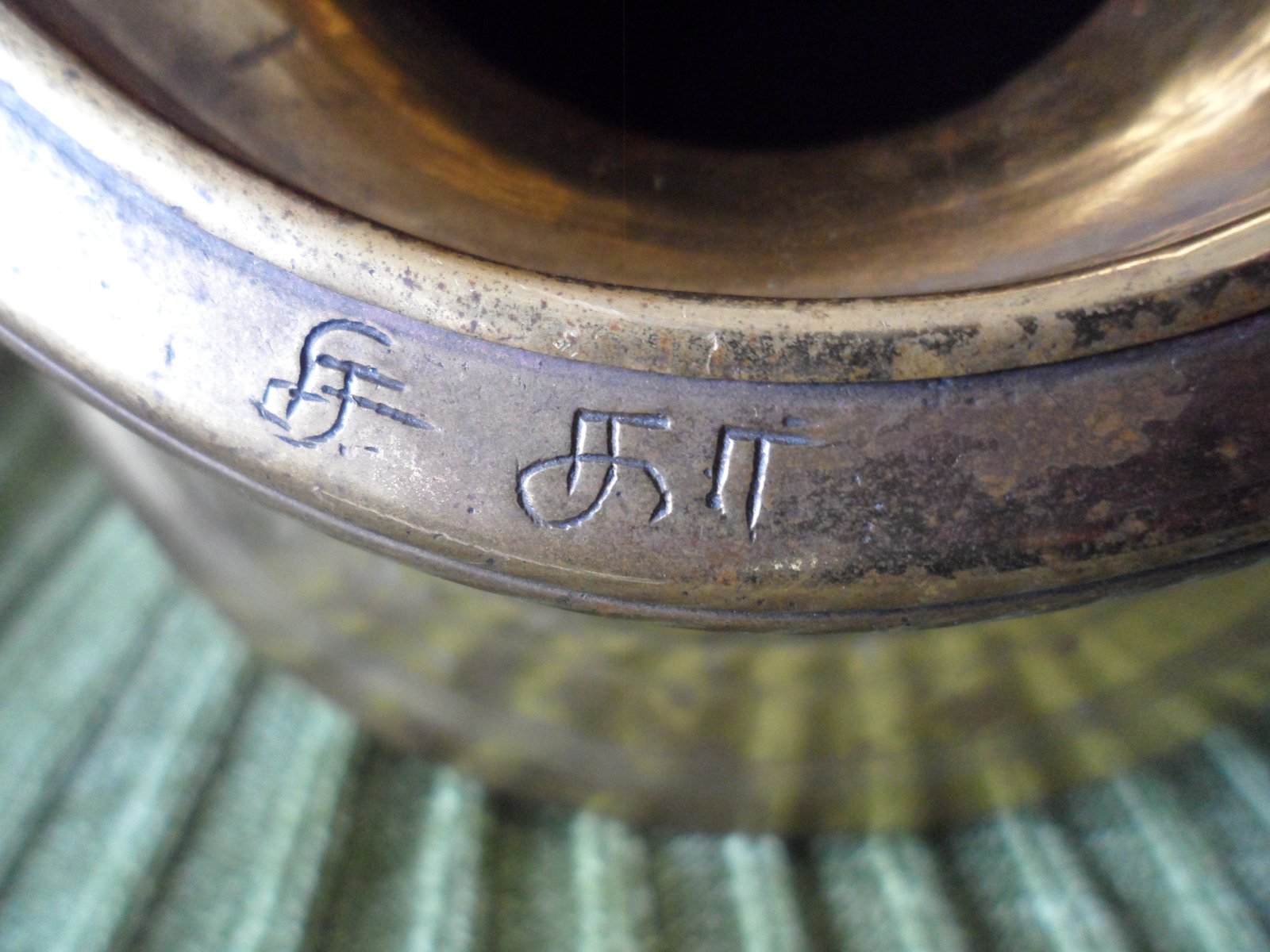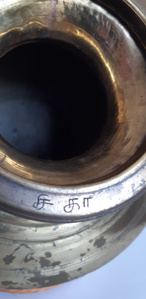 | 这个图像中的文字是泰米尔语(Tamil)。常见的含义参考:姓名缩写:在印度的金属器皿(如黄铜锅、罐子)上,这种刻字非常常见,通常是所有者的名字缩写,用来防止在大家庭或社区聚会中丢失或混淆。特定的词汇:在泰米尔语中,"_1_"