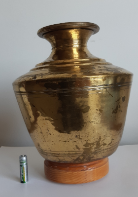 另:梵语(英文:Sanskrit language): 印度的古典语言。佛教称此语为佛教守护神梵天所造,因此称其为梵语/梵文。现代语言学研究表明,梵语是印欧语系的印度-伊朗语族的印度-雅利安语支的一种语言,是印欧语系最古老的语言之一,同时对汉藏语系有很大的影响。梵语是现今印度国家法定的22种官方语言之一,但已经不是日常生活的交流语言,2001年仅有1.4万人掌握该语言,是印度官方语言中使用人数最少的语言,梵语与拉丁文一样已经成为语言学研究的活化石。厚重、美观的兰札体字母流行于西藏和尼泊尔,并且随着中国清朝统治阶层对藏传佛教的信仰,流行于中国汉地。西藏同时还使用一种叫做瓦德体的字母来书写梵语,其实它只是兰札体的一种无头化变体。藏文、蒙文、托忒蒙文、满文都有用各自的文字转写梵语的体系。梵文在中国明代的瓷器上也多有体现,多与佛教或教派有关。粗略地说,方形字体,在公元4到8世纪,演化出笈多文(Gupta)。笈多文对汉传佛教影响极大,东晋时期鸠摩罗什大量翻译的佛经、以及其后的法显法师赴印度求法时,都是使用这种样式的梵文。 拍卖与陈设价值评估: 它的美感在于“残缺的辉煌”。这种金层剥落后的沧桑感,在艺术收藏中被称为 "Distressed Gold"(受损金) 风格。无论是放在灯光直射的展柜,还是作为沉静的茶室摆件,它都能通过这种金属对比产生极强的视觉张力。作为艺术品拍卖亮点:厚金层带来的贵金属质感、独特的泰米尔语刻字(人文价值)、明确的年代损耗痕迹(真实性)。由于表面金层有明显脱落,这会影响其在“追求完美”类藏家眼中的价值,但对于“民俗历史类”或“□寂美学类”藏家来说,这反而是加分项。建议:如果送拍,应强调其“家族神龛祭祀用具”的身份,并保留这种原始的损耗状态,不要试图修复。