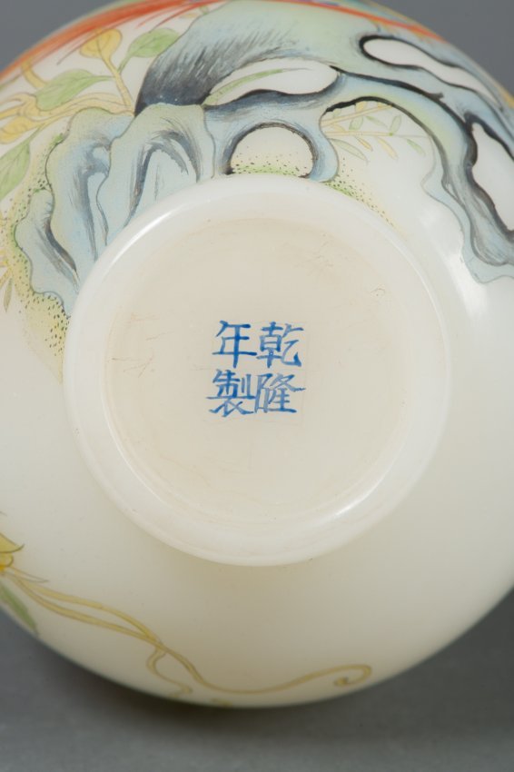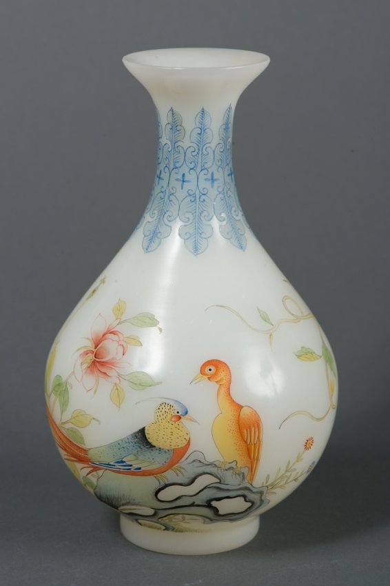 | Charming Chinese Peking glass vase, of bulbous form, finely painted with songbirds and auspicious foliages. Four characters Qianlong mark on base. H: 19 cm, D: 10 cm, 492 grams. | ||