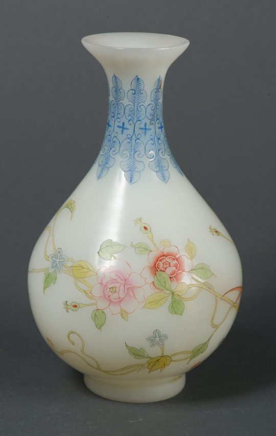 玻璃胎画珐琅玉壶春瓶 尺寸: 高:18cm,宽:12cm。 口径5.5厘米,底径5.5厘米。 拍自Sep 12, 2013年加拿大拍卖会