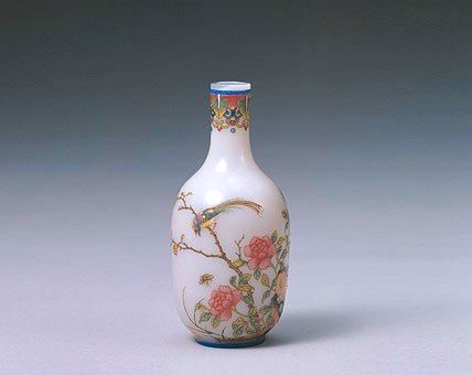 所以,玻璃胎画珐琅适于制作小件器物,如小瓶、鼻烟壶等。表面的绘画题材丰富,山水人物、花鸟鱼虫均可入画。其细润的玻璃胎体与绚丽的珐琅彩相互映衬,清丽艳美,令人爱不释手,雍正、乾隆两位皇帝每获成品都视若珍宝,将之加以精美包装,束之高阁,绝少赐人。