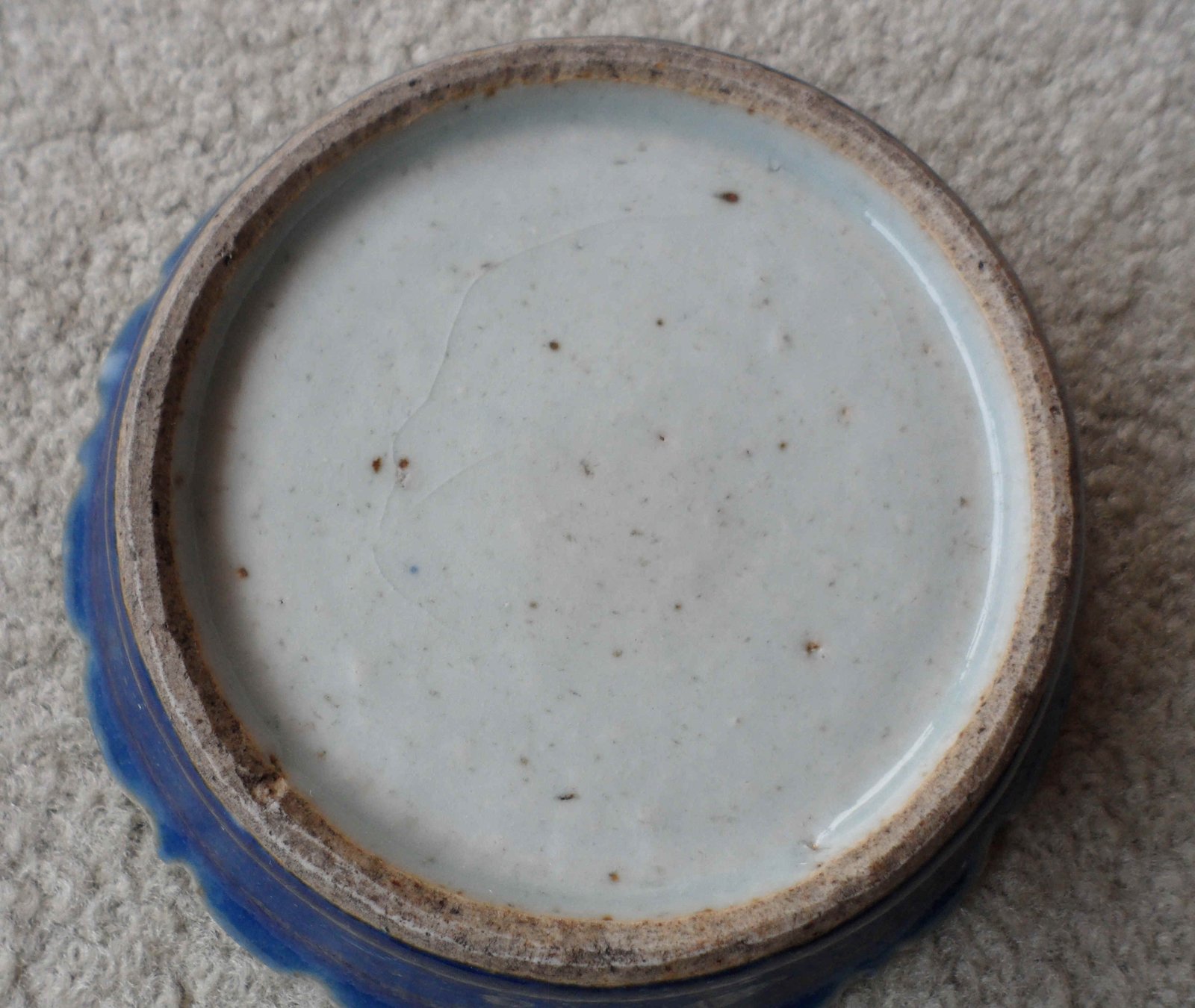 胎釉衔接:从底足图看,釉层肥厚且有青白色调,露胎处呈现出自然的干老感和火石红(淡黄色氧化斑)。这是明代中晚期景德镇民窑胎土提纯不够极端、烧制过程中金属元素自然氧化的典型表现。