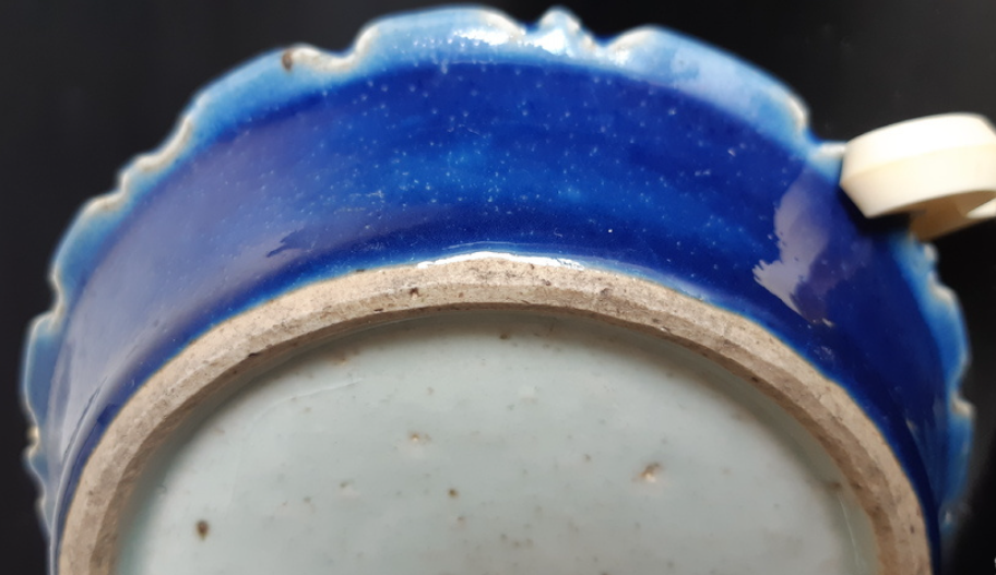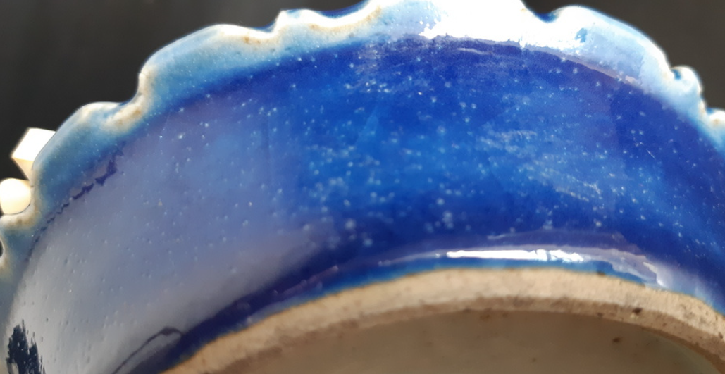 青花下沉:折沿处的青花色泽浓郁,且能看到颜色“吃”进釉里的沉降感。这种发色在嘉靖、万历时期多使用国产“石子青”混入少量“回青”,色调蓝中微泛紫或发灰,极具时代特征。