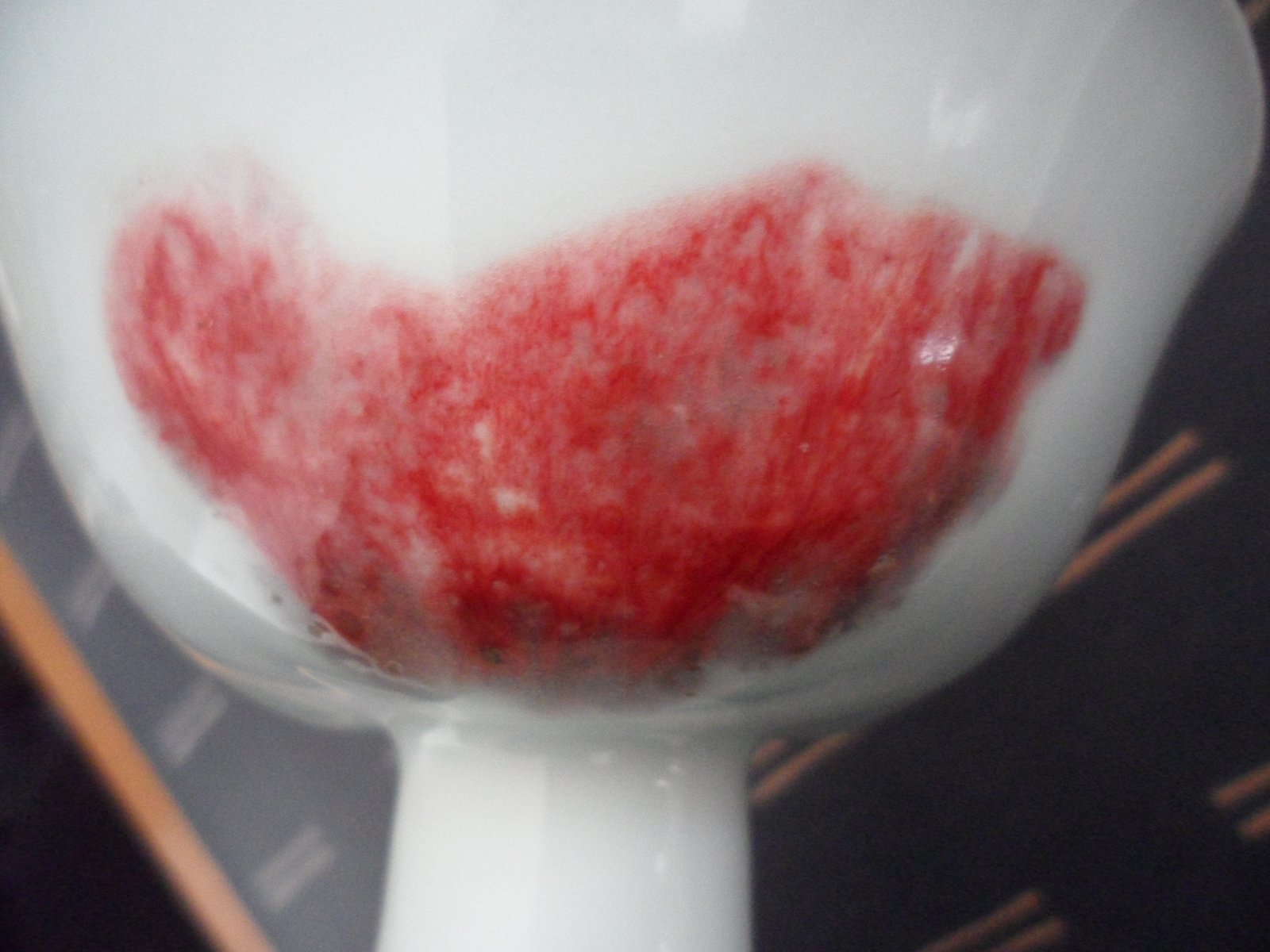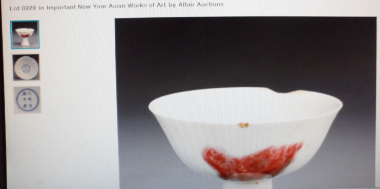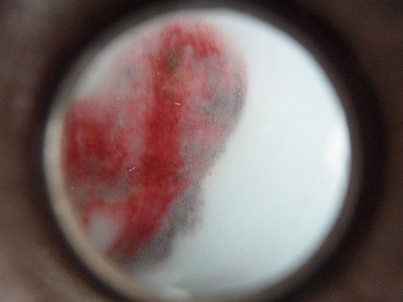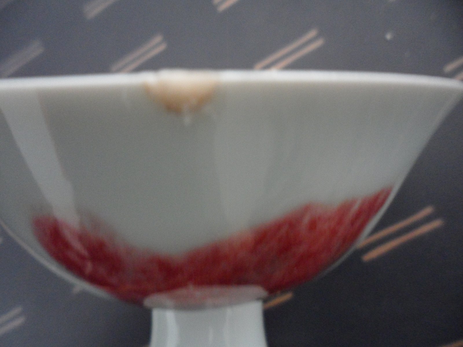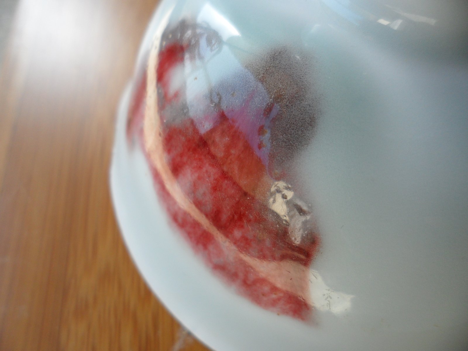 | 杯口缘有二处小冲受损已作修补(见图) | 放大境下,可见大小不一的气泡,灰色实际上是一种釉里红凝聚斑的时代特征,凝聚斑的凸起和釉面的下陷,铁元素从凝聚斑中游离出来浮向釉面,形成红色釉面的灰色铁锈斑(可能是红色和黑褐色的综合体现),虽然这污染了釉面,但却成为仿造者难以仿造的关键点。 | |||