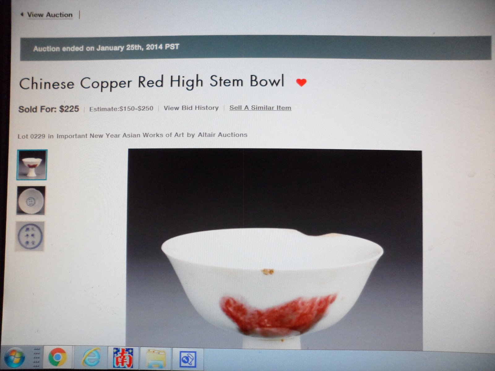 宣德影青釉三釉里红鱼纹高脚杯:高8.3厘米,上口径10.3厘米,足径5.0厘米。重220克。 来自Jan 25, 2014年美国拍卖会。 杯口缘有二处小冲受损(已作修补,见后图),其它品相完好。 撇口,弧壁,高足外侈,实底。通体施青白釉,外壁主纹以铜红饰釉里三鱼,头小尾大,饰三鳍于底部,呈写意形象。内壁无纹,杯心双青线内以青花书「大明宣德年制」二行六字楷款。胎骨略厚,器壁由下向上均匀由厚至薄,白釉莹润,泛浅青色。红釉色鲜,鱼尾边线釉薄处有蟹甲青釉晕,红釉带大小晶亮气泡,足底露胎,显露星点和线斑状铁质凝聚现象。胎釉间浅泛橙色。胎质白净坚实,造型自然流畅。 此宣德影青釉三釉里红鱼纹高脚杯为宣德的一代名杯,存世少见,彰显珍贵,体现和代表了宣德瓷器的造诣水准。 宣德以后期也有仿着,但仿不出这种玉质般造型自然流畅而带有时代特征的杯子了。