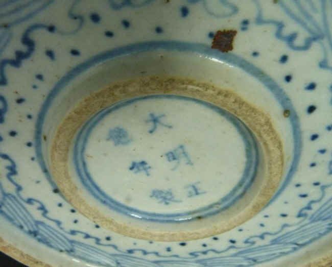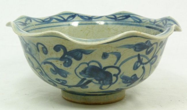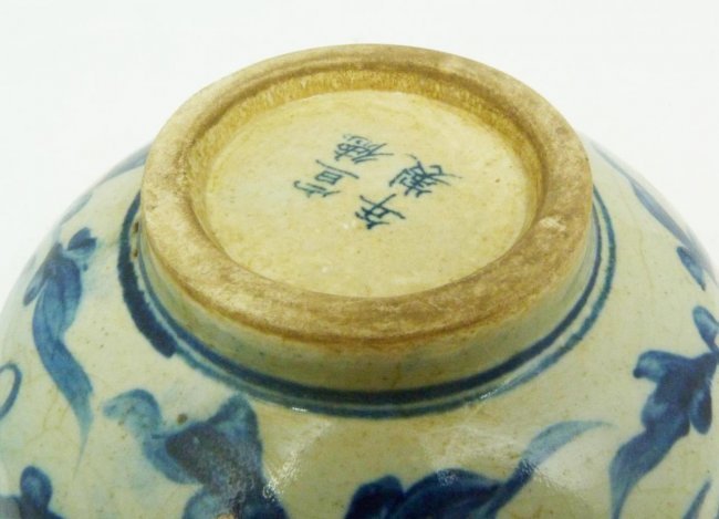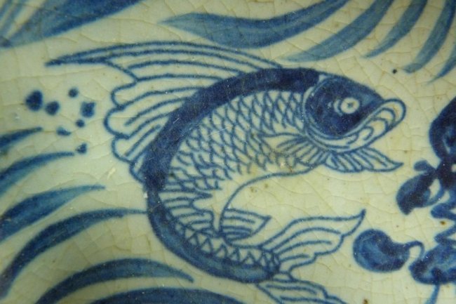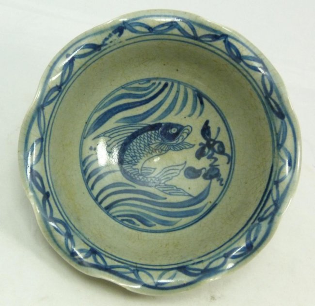 CHINESE PORCELAIN BLUE AND WHITE FISH BOWL DescriptionDepicts fish swimming in center of scalloped edge bowl. Foliage design all around. Calligraphy marks on bottom. Measures 6 3/4" (17.5 cm) diameter and 3 1/4" (8.5 cm) height. Aug 29, 2013. Elite Decorative Arts 1034 Gateway Boulevard |