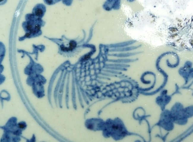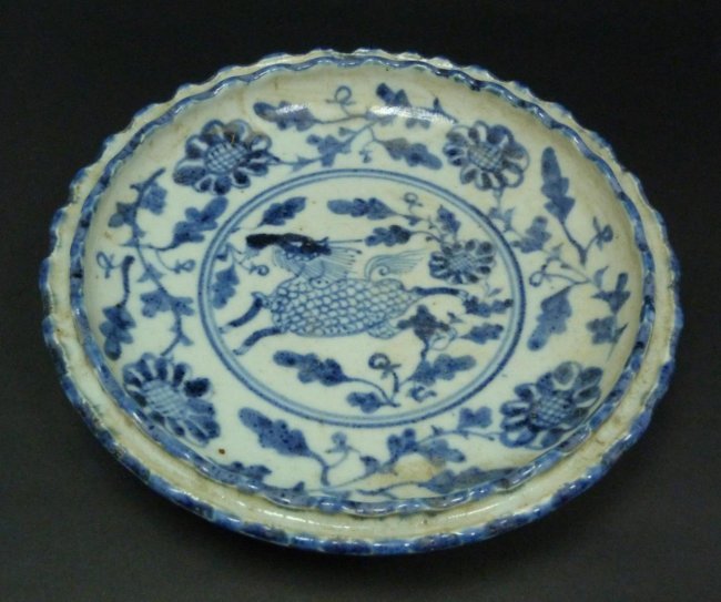 DescriptionHas scalloped edge with blue and white flowers. Each one depicts animal figure in center. Calligraphy marks on bottom. Measures 8 1/4" (21 cm) diameter.