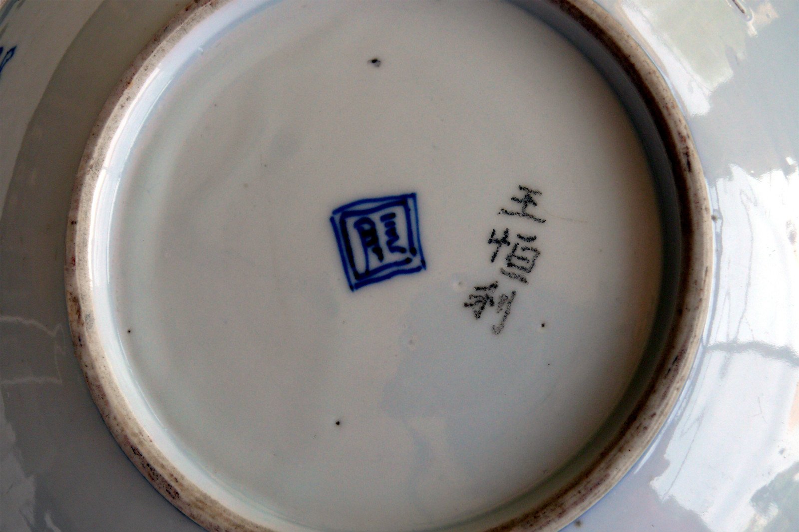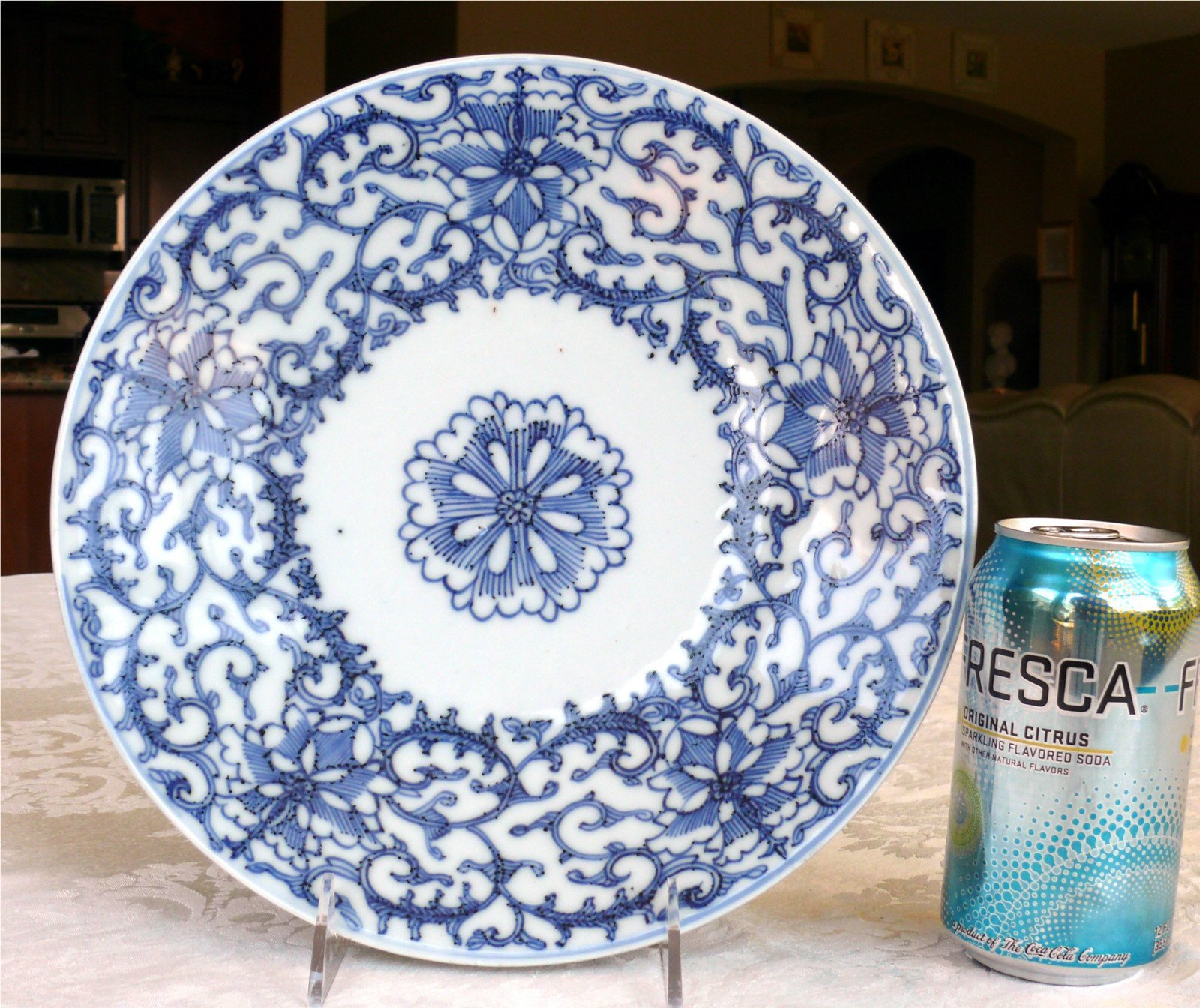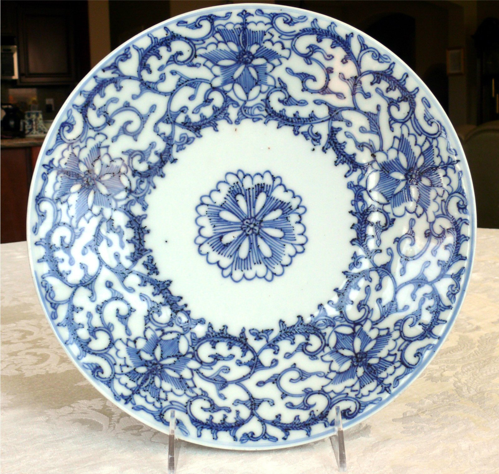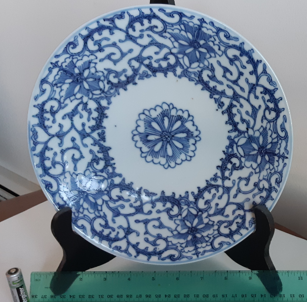 From my Asian antiques estate collection, I'm pleased to offer this outstanding Chinese blue and white porcelain plate, 10-5/8" in diameter with a fungus scroll decorating the rim. Fungus is an emblem of longevity in the Chinese culture. The plate dates to the Ming Dynasty (1368-1644) and has a seal on the underside. It also has an incised inscription on the bottom. The plate has no damage.