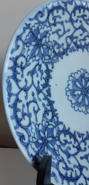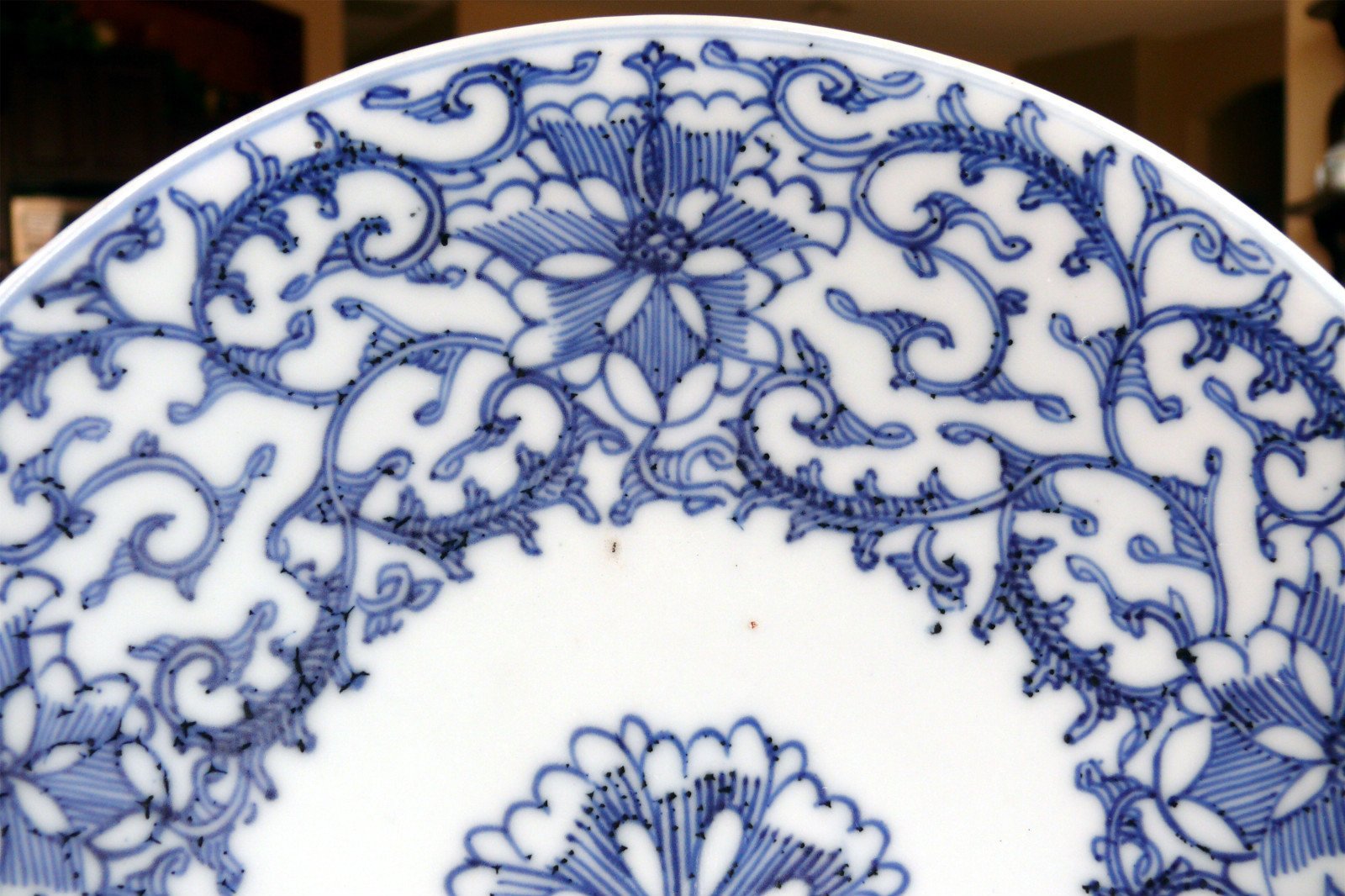 从目前的古玩市场来看,我们经常能看到的是直径22厘米以下尺寸的盘子,直径27厘米以上的全品相(古玩行术语,指无磕碰、无冲纹、无爆釉)大盘较难见到。从市场价格来看,尺寸大与尺寸小的盘子价格相差很大,如同样是清代雍正青花“一束莲”全品相盘子,目前,直径39厘米的市场价格为20多万元,直径27厘米的为4.5万元左右,直径22厘米的只有8000元上下。从收藏投资前景来看,直径大的盘子升值潜力会更大,这是收藏爱好者应该注意的。