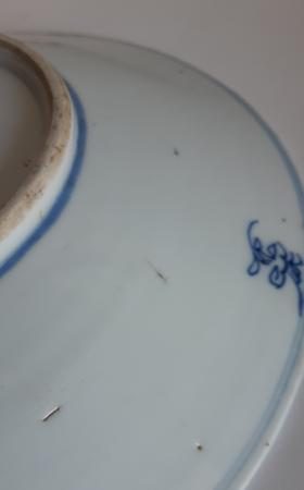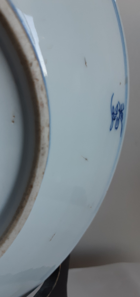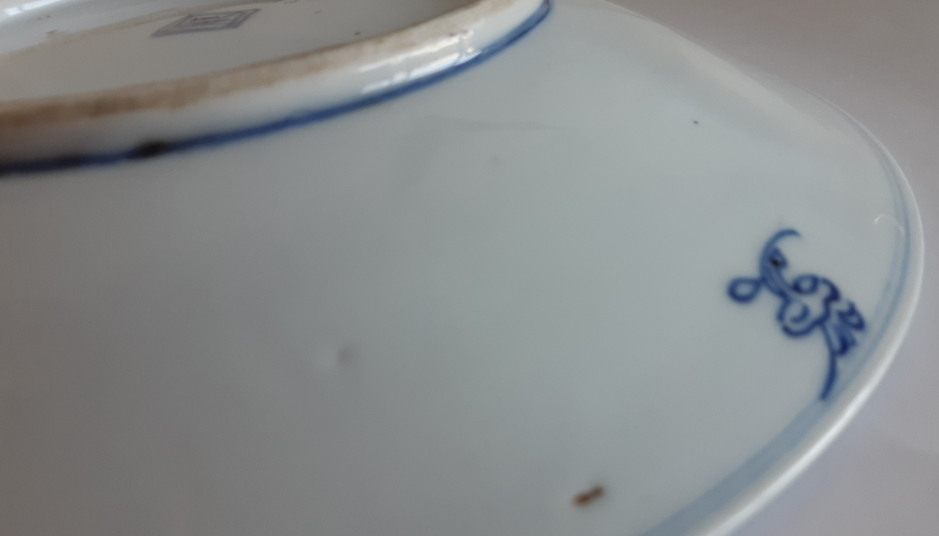 盘子反面可见棕眼和亚光现象,胎质干硬而白净,青花发色淡雅。