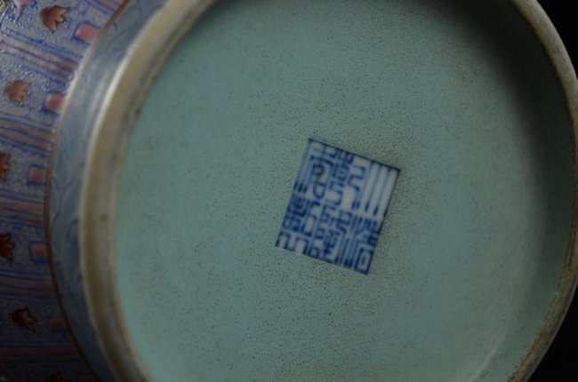 款识:乾隆粉彩的官窑器大多书“大清乾隆年制”六字篆书款,少数书“乾隆年制”四字篆书款。民窑器亦有书六字及四字篆款的,但款字极不工整。
