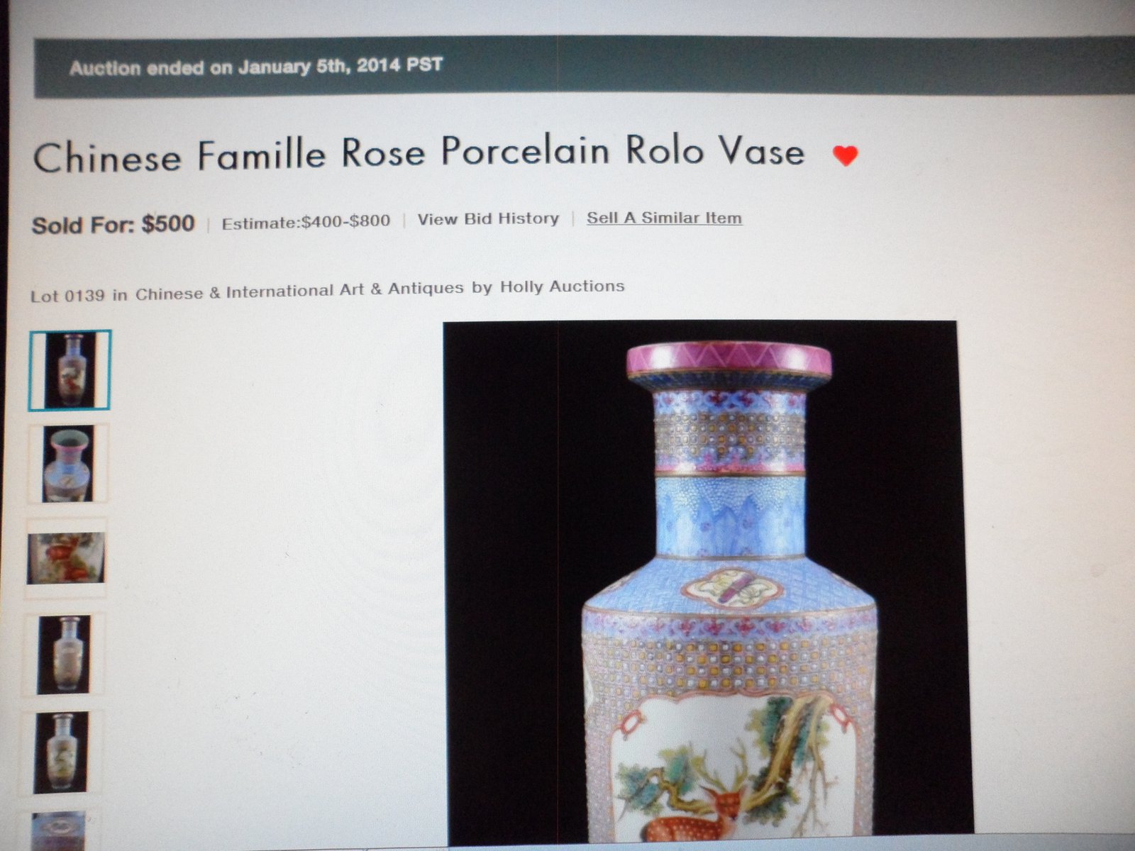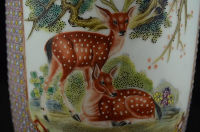 高:高14.5英寸。 拍自Jan 05, 2014年美国拍卖会。 特点:造型来自仿康熙流行的棒槌瓶,以纹饰繁密、染画工整取胜,实属罕见。 Chinese Famille Rose Porcelain Rolo Vase with two Cartouches depicting Dear in a Garden Landscape setting. H: 14 1/2 Inches |