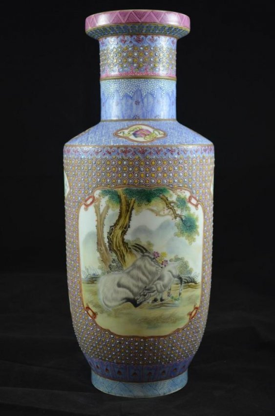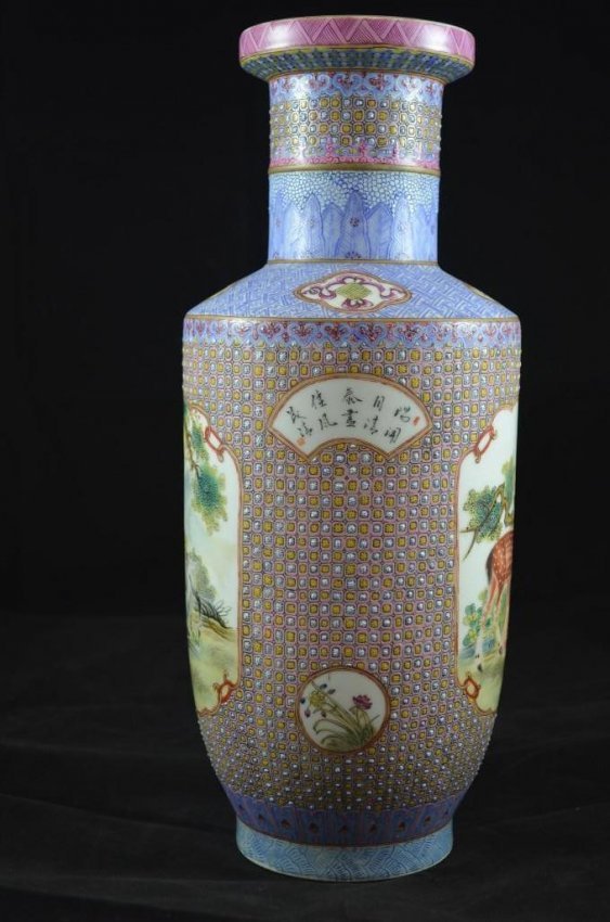 乾隆粉彩棒槌瓶 高:高14.5英寸。 拍自Jan 05, 2014年美国拍卖会。 特点:造型来自仿康熙流行的棒槌瓶,以纹饰繁密、染画工整取胜,实属罕见。 Chinese Famille Rose Porcelain Rolo Vase with two Cartouches depicting Dear in a Garden Landscape setting. H: 14 1/2 Inches |