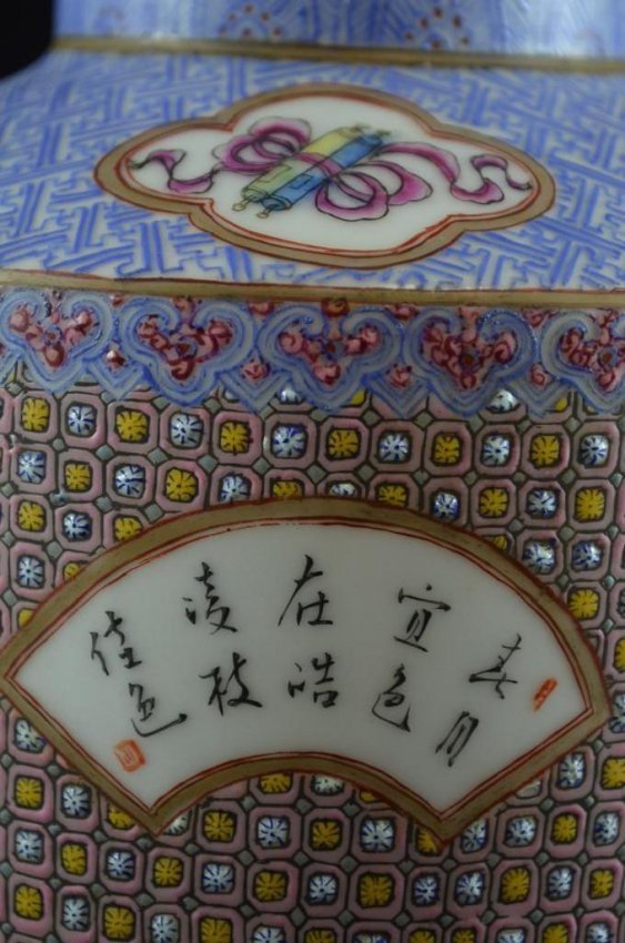 乾隆官窑粉彩的纹饰一般是“大内”送来的图样,主题纹饰按不同时节都有严格规定。除以粉彩绘画为主,还常加绘料彩、金彩或黑彩,或与青花、五彩、斗彩并施于一器,这种在一件器物上施多种彩或同时以各种彩绘工艺制作的乾隆粉彩,可说是集多种陶瓷工艺成就于一身,充分反映了乾隆朝制瓷工艺的精湛。 乾隆时期,(1736---1795)为清代瓷器制作的鼎盛期,从乾隆开始,粉彩在彩瓷的领域中几乎完全取代了五彩的地位。这时粉彩在装饰工艺上渐趋繁缛,形制上丰富多样,特别是用于陈设的各大器型,如转颈瓶,转心瓶,天球瓶,扁瓶,多角瓶等甚为流行。这些 工艺繁复,色彩浓艳明丽的器皿是乾隆彩瓷志制品中的杰出代表。