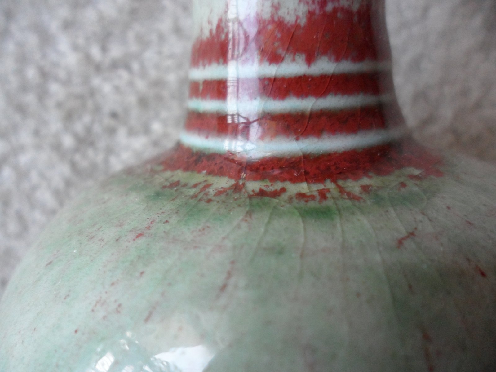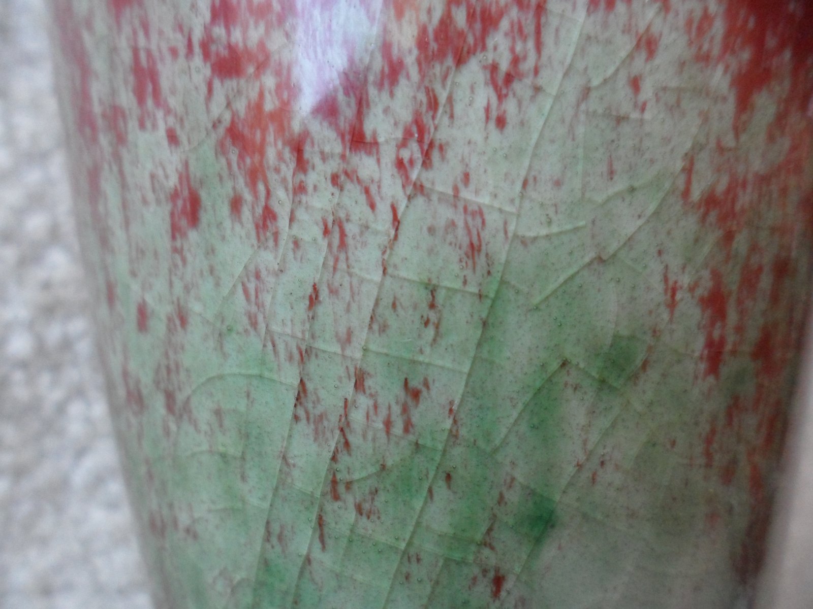 釉面自然裂纹 (康熙豇豆红常见为斑点状绿苔,而能烧成“片绿”则非常少见,最佳珍品。) |