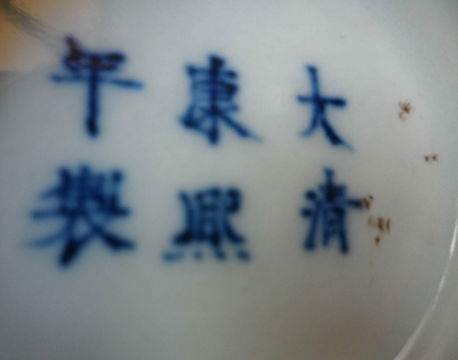 胎质坚硬,青花款识自然沉浸入胎骨,“大清康熙年制”六字三行无围栏楷书康熙朝纪年款。 |