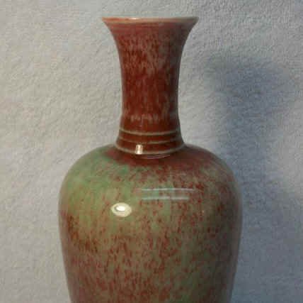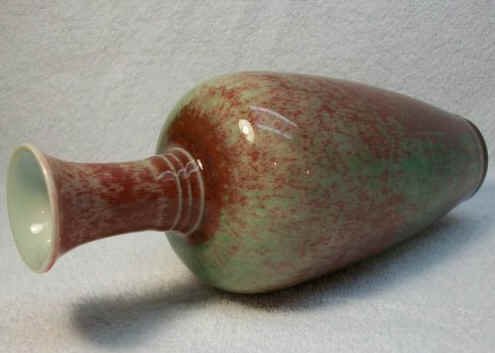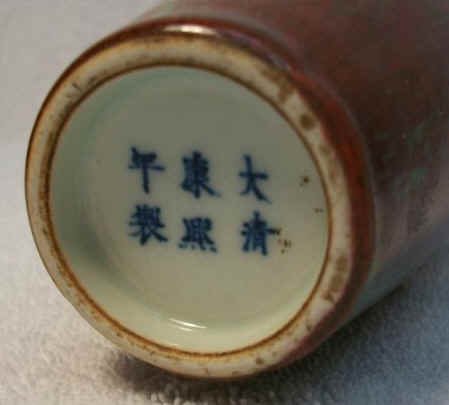 豇豆红釉。这是康熙朝红釉器中最名貴品种之一,因其釉色如豇豆而名。它在高温铜红釉中烧成难度极大,故少有大件器。一般器内为白釉,外壁由工匠用吹釉法,以竹管蒙上细纱,分几次将釉料均匀地吹于器物外壁后高温烧成。由于吹釉的层次不同和烧成焰性的影响,釉面必将出现水渍般的现象以及有点点绿斑。这既点缀了器物之美,又成了鉴识的一个特征。豇豆红仿制极难,雍正时已不纯正。清末、民国初的仿品,均未能达真品的幽雅娇艳,往往偏于灰暗,水渍刻板,且少见绿色苔点。