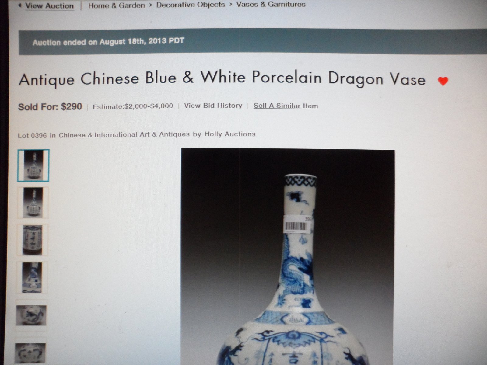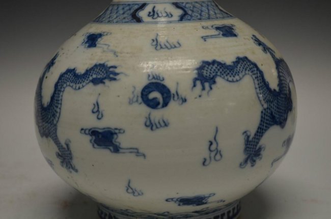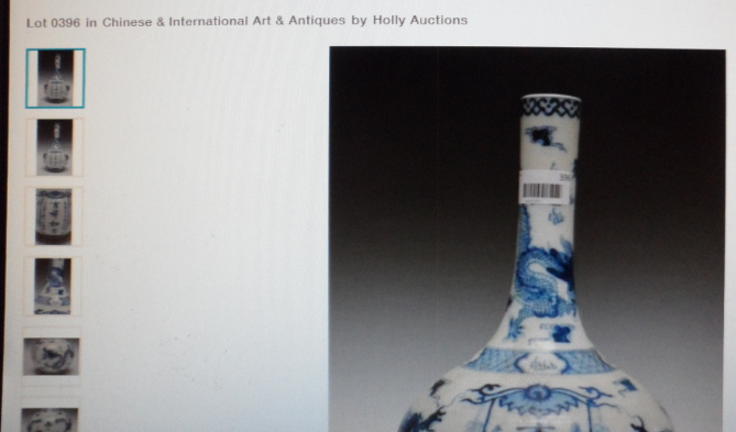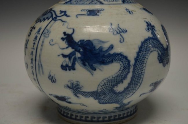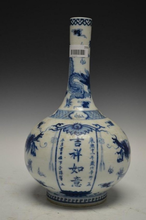 Reference: Antique Chinese Blue & White Porcelain Dragon Vase Chinese Blue & White Porcelain Dragon Bottle Vase, H: 12 Inches Aug 18, 2013. Holly Auctions 770 East Green Street 康熙青花天球瓶 拍自Aug 18, 2013.年美国拍卖会 |