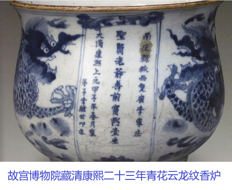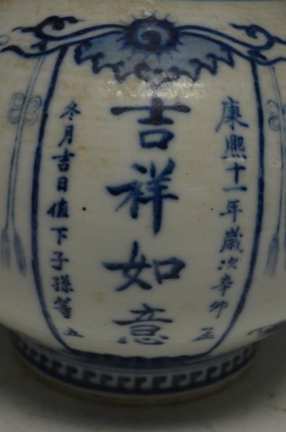 特征:绘有三条青花龙纹,瓶颈一条,瓶体对称二条。均为青花五抓龙。釉面上泛自然光晕,青花沉浸,自然磨损老化外观。可见旋纹,爆釉点。胎质坚硬,胎白质干,青花款识自然沉浸入胎骨,“大清康熙年制”六字二行无围栏楷书康熙朝纪年款。器身有吉祥如意等祝福用语,应为记典器物。 |