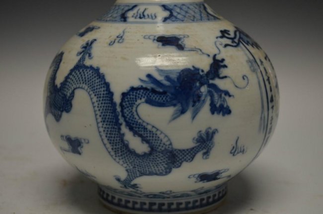 Antique Chinese Blue & White Porcelain Dragon Vase Chinese Blue & White Porcelain Dragon Bottle Vase, H: 12 Inches