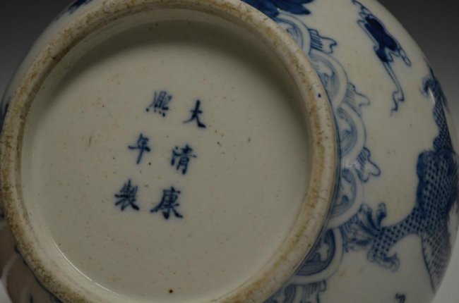 胎质坚硬,胎白质干,青花款识自然沉浸入胎骨,“大清康熙年制”六字二行无围栏楷书康熙朝纪年款。 | ||