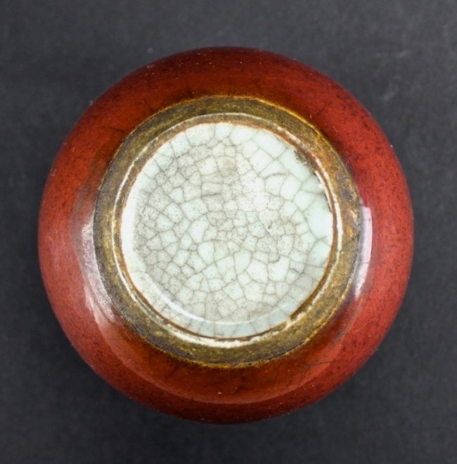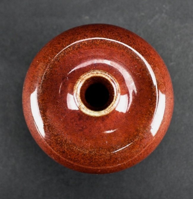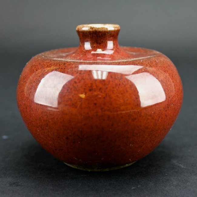 DescriptionChinese Red Porcelain Apple Zun Vase; Size: 3 1/4 x 2 3/4" 郎红釉苹果尊 (3 1/4 x 2 3/4")