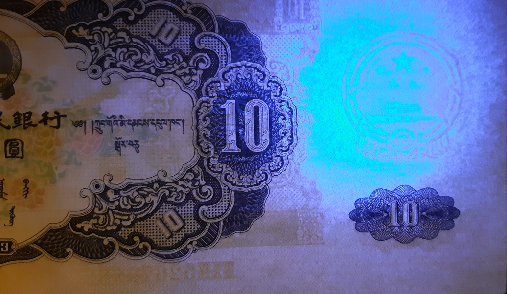 53年版十元人民币验钞紫外灯光下: