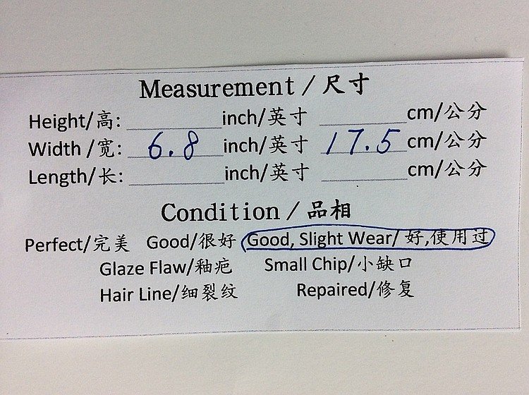 宽: 18cm; 高:4cm; Weight: 200g 说明: 釉面温润如玉,有干燥自然的小碎开片,影青釉的刻划花飘逸豪放、收放自如。瓷胎极薄(200g),所刻划的花纹迎光照之内外皆可映见。 影青釉是汉族传统制瓷工艺中的珍品,是对宋代景德镇烧制的具有独特风格的瓷器的名称。由于它的釉色介于青白之间,青中带白、白中闪青,加之瓷胎极薄,所刻划的花纹迎光照之内外皆可映见,因此被称为影青釉。 宋代湖田影青釉天青色,透亮,润泽;花纹雕饰方面,有印花、画花、刻花、无印贴花、堆贴镂空花、等几种花纹。影青“的刻花、划花大多数构图简练,给人以雅致之感。花纹多装饰在碗、盘的内壁,刻花花纹吃刀有深有浅,施釉后,吃刀深处积釉成青绿色,浅处泛白,层次感很强。刻印花图案内容主要是花卉。 |