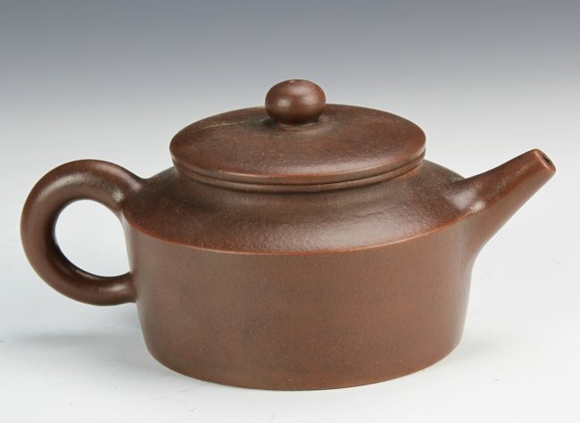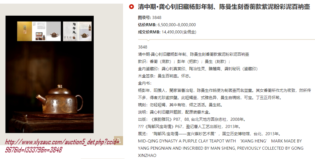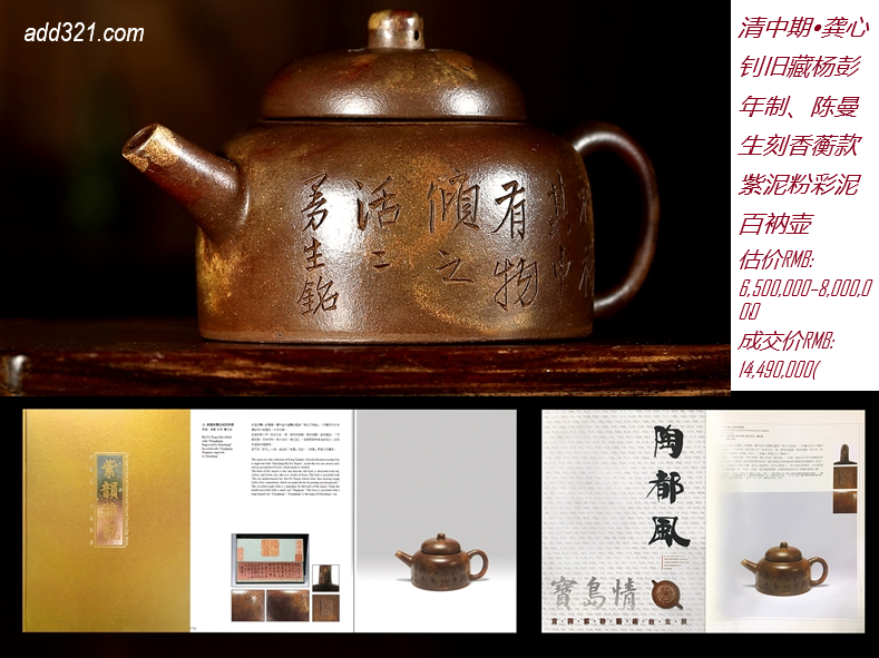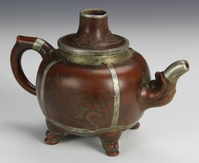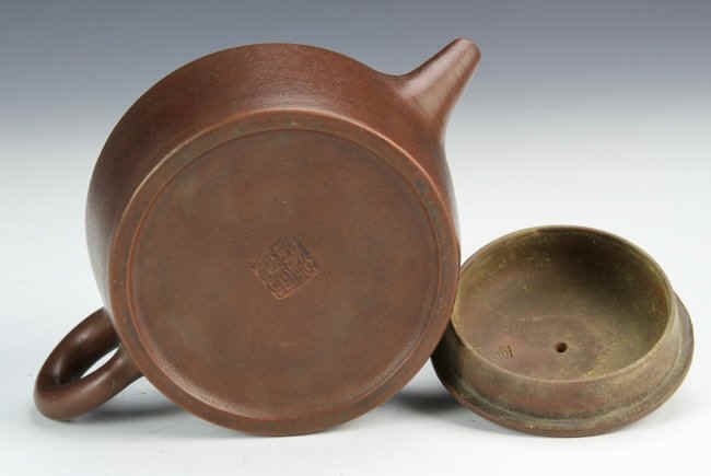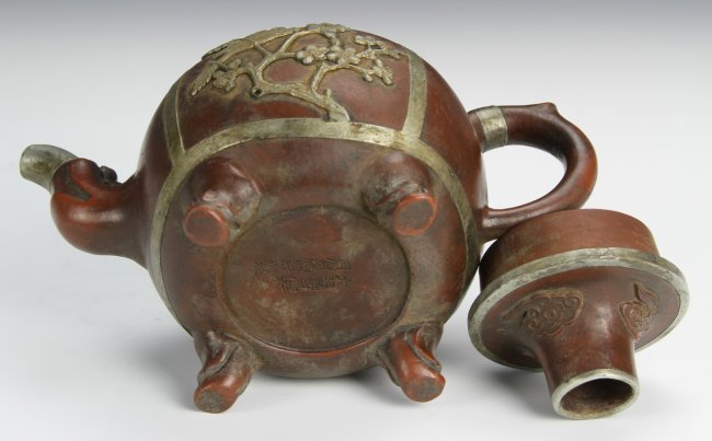 尺寸(英寸): Height (高) 5 in., Width (宽)7 in. 周后溪为明万历至崇祯年人,时大彬弟子。善制小壶,妙在质朴。 该紫砂壶以银制花鸟装饰,盖有祥云装饰,底款“大明崇祯初春周后溪制”。自然包浆,古老精制。彰显了明代制壶的高级工艺,明代紫砂壶流传至今已经非常少见,此紫砂壶实为紫砂壶爱好者或紫砂艺术博物馆的难得收藏品。 该紫砂壶来自美国2013年的Altair拍卖公司。 |