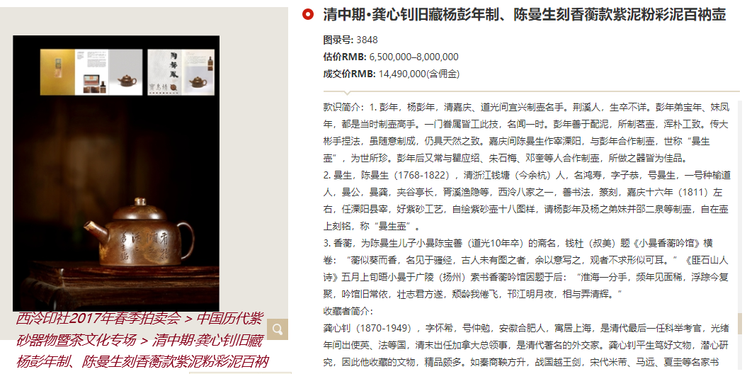 3848 清中期•龚心钊旧藏杨彭年制、陈曼生刻香蘅款紫泥粉彩泥百衲壶 款识:香蘅(底款);彭年(把款);曼生(刻款); 盒内鉴藏印:龚心钊真赏印、陶冶性灵、瞻麓斋、龚钊秘玩(鉴藏印) 木盒签条:曼生百衲壶。怀志。 盒内书: 杨彭年,阳羡人,合家皆善冶陶,陈曼生作铭使为制茗壶而名益重。其女香蘅所作尤为密致,然所传不多,得者尤珍逾拱璧。此□褐壶,式雅色异,曼生自镌铭,可宝。丁丑正月怀希。 镌刻:勿轻□褐,其中有物,倾之活活。曼生铭。 说明:龚心钊旧藏并题跋,配原装瘿木盒。 出版:《紫韵雅玩》P87、88, 台北天地方圆杂志社,2008年。 ???《陶都风宝岛情》P67,盈记唐人工艺出版社,2013年。 展览:“陶都风•宝岛情──宜兴紫砂艺术展”,国立历史博物馆,台北,2013年。 MID-QING DYNASTY A PURPLE CLAY TEAPOT WITH ‘XIANG HENG’ MARK MADE BY YANG PENGNIAN AND INSCRIBED BY MAN SHENG, PREVIOUSLY COLLECTED BY GONG XINZHAO Note: Inscribed by Gong Xinzhao. Illustrated: 1. Charms of Zisha Art, pp. 87-88, Taibei Tianfang Diyuan Magazine, 2008 2. Exhibition of Yixing Zisha Works of Art in Taiwan, p. 67, Yingji Tangren Crafts Publishing House, 2013 Exhjibited: 'Exhibition of Yixing Zisha Works of Art in Taiwan', National Museum of History, Taipei, 2013 6×11cm RMB: 6,500,000━8,000,000 款识简介:1. 彭年,杨彭年,清嘉庆、道光间宜兴制壶名手。荆溪人,生卒不详。彭年弟宝年、妹凤年,都是当时制壶高手。一门眷属皆工此技,名闻一时。彭年善于配泥,所制茗壶,浑朴工致。传大彬手捏法,虽随意制成,仍具天然之致。嘉庆间陈曼生作宰溧阳,与彭年合作制壶,世称“曼生壶”,为世所珍。彭年后又常与瞿应绍、朱石梅、邓奎等人合作制壶,所做之器皆为佳品。 2. 曼生,陈曼生(1768-1822),清浙江钱塘(今余杭)人,名鸿寿,字子恭,号曼生,一号种榆道人,曼公,曼龚,夹谷亭长,胥溪渔隐等,西泠八家之一,善书法,篆刻,嘉庆十六年(1811)左右,任溧阳县宰,好紫砂工艺,自绘紫砂壶十八图样,请杨彭年及杨之弟妹并邵二泉等制壶,自在壶上刻铭,称“曼生壶”。 3. 香蘅,为陈曼生儿子小曼陈宝善(道光10年卒)的斋名,钱杜(叔美)题《小曼香蘅吟馆》横卷:“蘅似葵而香,名见于骚经,古人未有图之者,余以意写之,观者不求形似可耳。”《匪石山人诗》五月上旬晤小曼于广陵(扬州)索书香蘅吟馆因题于后:“淮海一分手,频年见面稀,浮踪今复聚,吟馆旧常依,壮志君方遂,颓龄我倦飞,邗江明月夜,相与弄清辉。” 收藏者简介: 龚心钊(1870-1949),字怀希,号仲勉,安徽合肥人,寓居上海,是清代最后一任科举考官,光绪年间出使英、法等国,清末出任加拿大总领事,是清代著名的外交家。龚心钊平生笃好文物,潜心研究,因此他收藏的文物,精品颇多。如秦商鞅方升,战国越王剑,宋代米芾、马远、夏圭等名家书画,宋汝窑盘,以及时大彬、徐友泉、陈鸣远、陈曼生等制的紫砂壶。他所藏印章,既丰且精,有自战国至六朝的铜、玉、石的官、私印章2000余方。1960年,龚心钊的后辈将珍藏的500余件文物,捐献给上海市文物管理委员会,受到市人民政府表彰。 http://www.xlysauc.com/auction5_det.php?ccid=967&id=133379&n=3848 西泠印社2017年春季拍卖会 > 中国历代紫砂器物暨茶文化专场 > 清中期•龚心钊旧藏杨彭年制、陈曼生刻香蘅款紫泥粉彩泥百衲壶 |