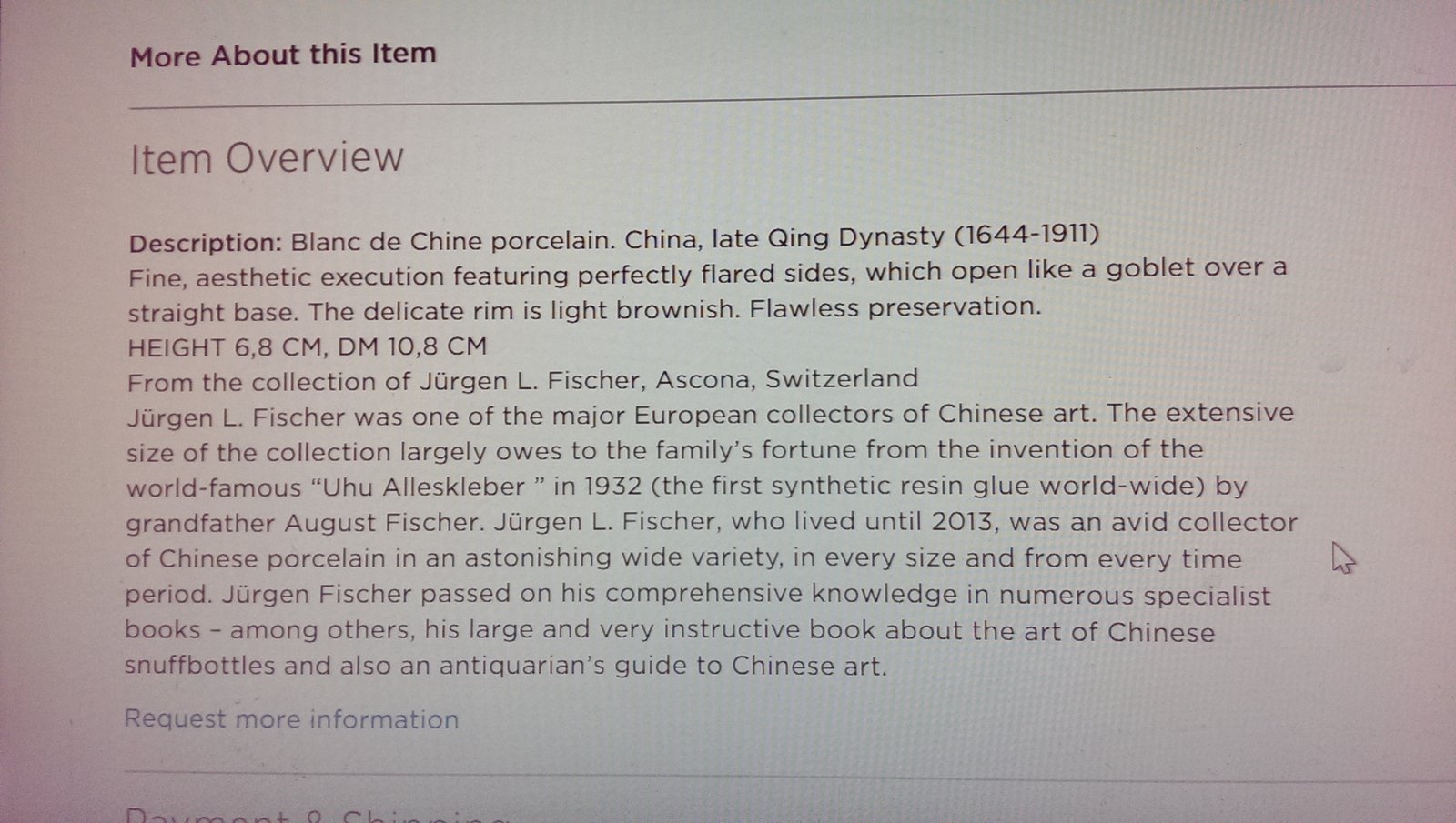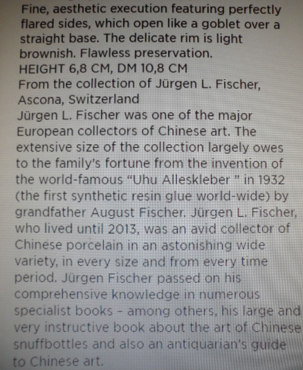 康熙甜白釉碗HEIGHT(高) 6,8 CM, DM(直径) 10,8 CM 造型优雅甜白釉碗,有康熙朝瓷釉特点;来自欧洲收藏家L. Fischer(主要收藏中国古董)。 Chine porcelain. Fine, aesthetic execution featuring perfectly flared sides, which open like a goblet over a straight base. The delicate rim is light brownish. Flawless preservation. From the collection of Jürgen L. Fischer, Ascona, Switzerland Jürgen L. Fischer was one of the major European collectors of Chinese art. The extensive size of the collection largely owes to the family’s fortune from the invention of the world-famous “Uhu Alleskleber ” in 1932 (the first synthetic resin glue world-wide) by grandfather August Fischer. Jürgen L. Fischer, who lived until 2013, was an avid collector of Chinese porcelain in an astonishing wide variety, in every size and from every time period. Jürgen Fischer passed on his comprehensive knowledge in numerous specialist books – among others, his large and very instructive book about the art of Chinese snuffbottles and also an antiquarian’s guide to Chinese art. |