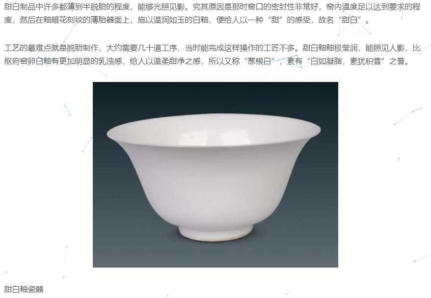 甜白釉甜白是永乐窑创烧的一种白釉。由于永乐白白瓷制品中许多都薄到半脱胎的程度,能够光照见影。在釉暗花刻纹的薄胎器面上,施以温润如玉的白釉,便给人以一种“甜”的感受,故名“甜白”。 景德镇甜白釉的烧制成功,为明代彩瓷的发展创造了有利条件。明清时代的斗彩、五彩、粉彩,只有在白瓷取得高度成就的基础上,才能显示出它的鲜艳色彩来。甜白釉在清代还有烧造。康熙甜白釉有奶粉般的色泽,白而莹润,无纹片,也称奶白。