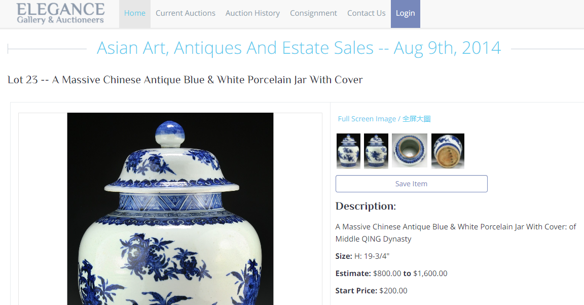 *来自Aug 09, 2014年美国拍卖会。 4601 Arden Dr. 11:00 AM - Aug 09, 2014Lot 23 A Massive Chinese Antique Blue & White Porcelain Jar