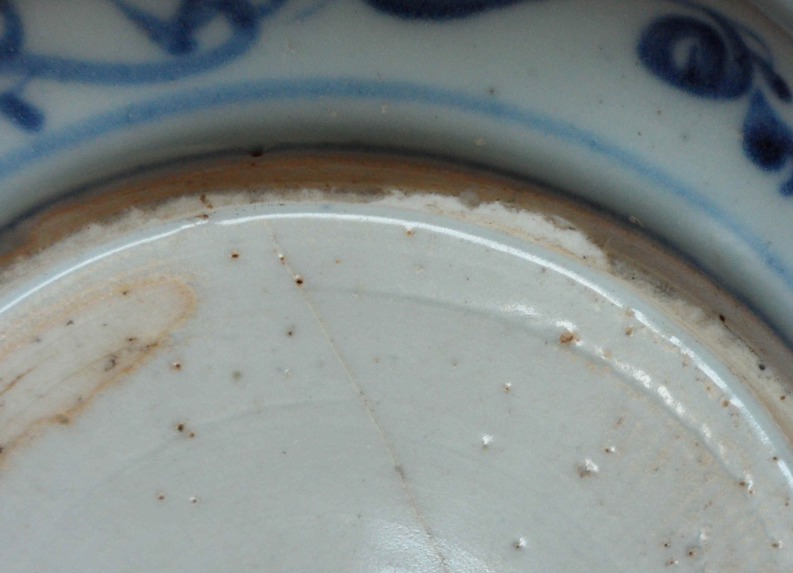 10、釉斑:有一部分砂底元青花瓷器底部有釉斑。釉斑或多或少,大小不等,形状不规则,一般呈青白釉色。为什么会特地加上这些并不美观的釉斑呢?经观察,我发现这些釉斑的分布有一定规律:即经常分布在圈足内墙根和外底边沿的交接处,外底中心区域。这不就是经常会出现裂缝的地方吗?由于胎泥的问题(如熟化程度不够)、成型的问题(如拉坯不匀)、瓷坯干燥环境问题(查有关资料,元代尚没有“晾晒池”这种玩意),所以生坯在干燥过程中的坼裂现象当比较常见,这些釉斑即是用来填补瓷坯缝隙的。再观察釉斑呈圆形的很少,许多都是呈不规则长条状的,又可证实我的推测。另外这些釉斑都很厚,也能说明此道理。现代一些元青花仿品,也效仿釉斑,但因为作伪者不明元代人在器底加釉斑的用意,或者任意挥洒,在不可能产生坼裂的部位也乱点一通,毫无道理可言。或者分布整齐、具装饰意味,不知古人是在需要的地方(也就是有坼裂的地方)才加釉斑的,并没有装饰意图,哪有这样整齐的分布?
