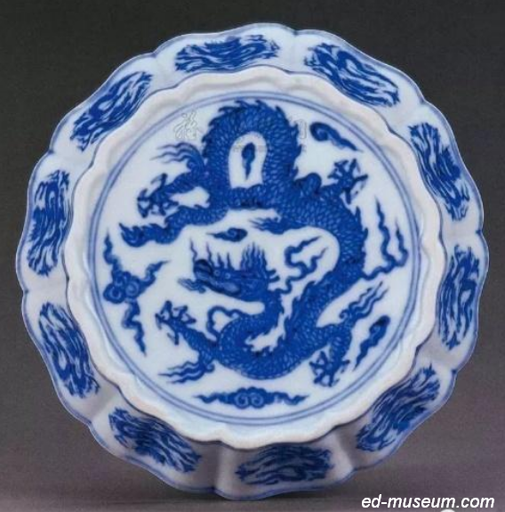 明永乐 青花内外底龙戏珠纹棱口洗 尺寸 18.3cm 成交价 RMB 43,809,813 佳士得香港 说明 这件笔洗精美绝伦,珍罕无比,造型优雅别致,青花纹饰洗泼鲜丽。器口作十瓣花卉形,器壁亦有相应棱边,自器口伸延至器足,造型明显取材自早期漆器。全器均以五爪龙纹作主题纹饰,使整体看来更生动多姿。十瓣棱壁外侧各饰一无框团龙,升龙与降龙相间。内外底各饰一条大型五爪龙,伴以祥云。全器共绘十二条五爪龙,实为御器中罕见。