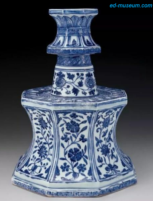 明永乐 青花折枝花卉八方烛台 尺寸 高29.8cm 成交价 RMB 20,350,000 北京翰海 参阅:耿宝昌《故宫博物院藏•明初青花瓷》图版30、31。 炎黄艺术馆编《景德镇出土元明官窑瓷器》图版98、图版116。 《中国陶瓷全集明》(上)图版40。 故宫博物院藏文物珍品大系《青花釉里红•上》49页第47号。 上海敬华首拍2001年6月23日第105号。