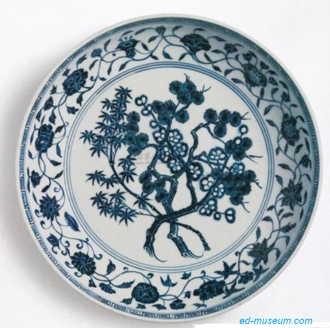 明永乐 青花「岁寒三友」图大盘 尺寸 34cm 成交价 RMB 14,701,320 香港苏富比 出版:康蕊君,《玫茵堂中国陶瓷》,伦敦,1994-2010年,卷4,编号1640 来源:香港私人收藏 伦敦Eskenazi Ltd 1944年 展览:《Yuan and Early Ming Blue and White Porcelain》,Eskenazi Ltd,伦敦,1994年,编号16(图例) 《Evolution to Perfection. Chinese Ceramics from the Melyintang Collection》Sporting d,Hiver,蒙地卡罗,1996年,编号114(图例) 「岁寒三友」,指翠竹、青松、冬梅三种花木,象征不畏严霜之高洁风格及永恒不变之忠贞友谊。此题材颇为流行,相若作例可见,但少为钴青线廓留白寒梅纹绘者。 |