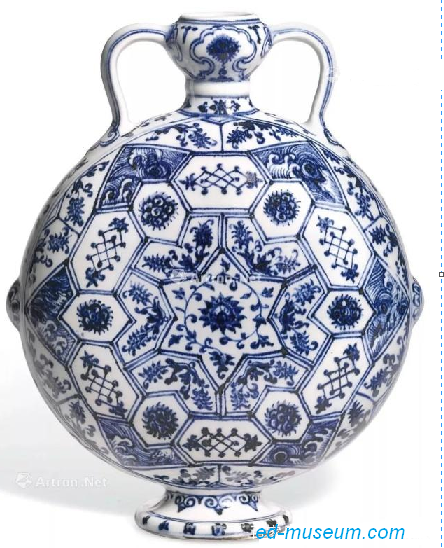 明永乐 青花花卉锦纹如意耳扁壶 尺寸 24.5cm 成交价 RMB 92,726,280 香港苏富比 出版:Adrian Joseph,《Ming Porcelains. Their Origins and Development》,伦敦,1971年,载封面及图版 22号 说明 永乐年间(1403-24年),御窑作坊出品各式瓷器,新颖独特,永乐帝对此应甚为熟悉。然而本壶器形纹饰,实属其中最为巧妙之作。该时期之瓷作,器形多以中东雏本为模,唯本品器形纹饰出类拔萃,更胜同侪。如此几何纹饰,明显取自中东样式,繁复华丽,罕见于中国御瓷,即使元代(1279-1369年)与中东交流密切,几何构图流行于青花盘,亦仅取中东器之构图,纹饰仍然纯属中式,不如本品伊斯兰风格浓厚。 |